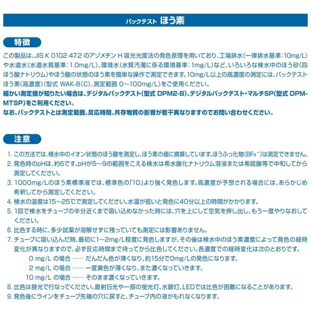この製品は、工場排水をはじめ、いろいろな検水中のほう砂(四ほう酸ナトリウム)やほう酸の状態のほう素を簡単な操作で短時間に測定することができます。