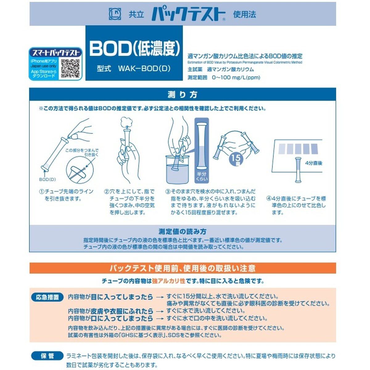 「パックテスト BOD(低濃度) 1箱(50本) 外装箱あり」共立理化学研究所 簡易水質検査器具 水質測定器 水質検査キット 環境測定 現地調査 排水 管理 飲料水 検査 環境 調査 教材 教育 自由研究 養魚管理 水槽 水質事故調査 井戸水 河川