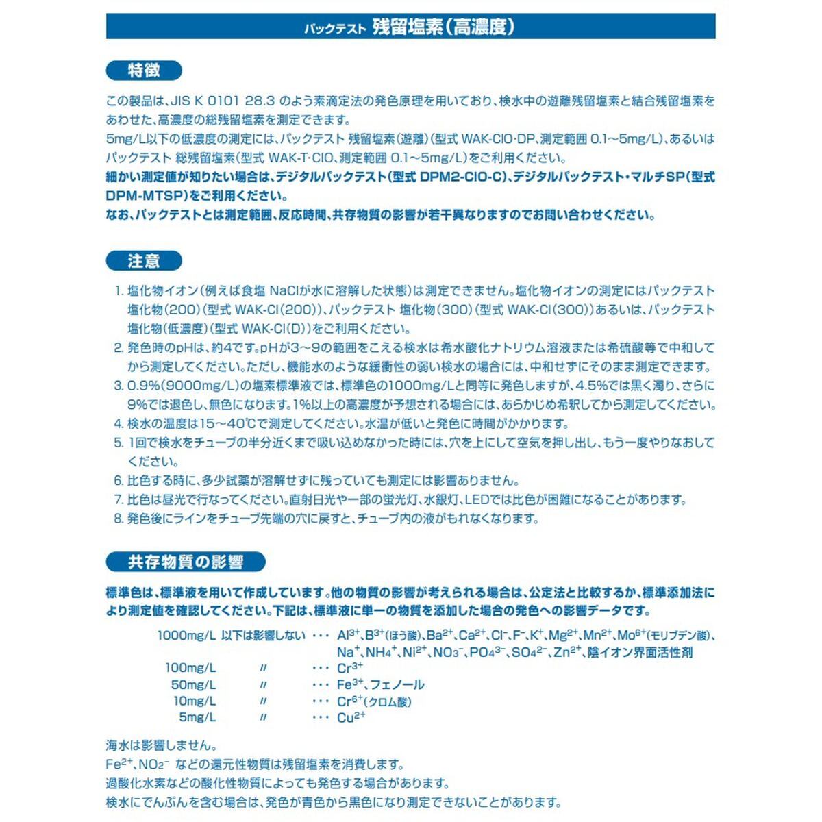 ※ばら売り商品(10本、5本、1本)には標準色(ケース入り) は付きません。 ※パックテスト使用前、使用後の取扱い注意 K-1試薬やK-2試薬など、前処理が必要な場合があります。 チューブの内容物は液性が高いものがありますので、デジタル説明書をお読みの上、 お客様ご自身の管理下で安全に使用してください。