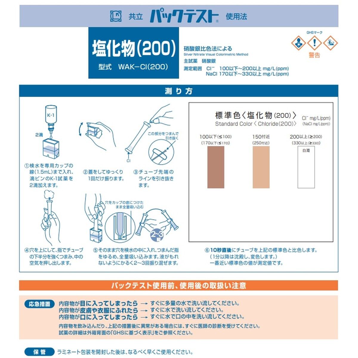 「パックテスト 塩化物(200) 1箱(40本) 外装箱あり」共立理化学研究所 簡易水質検査器具 水質測定器 水質検査キット 環境測定 現地調査 排水 管理 飲料水 検査 環境 調査 教材 教育 自由研究 養魚管理 水槽 水質事故調査 井戸水 河川