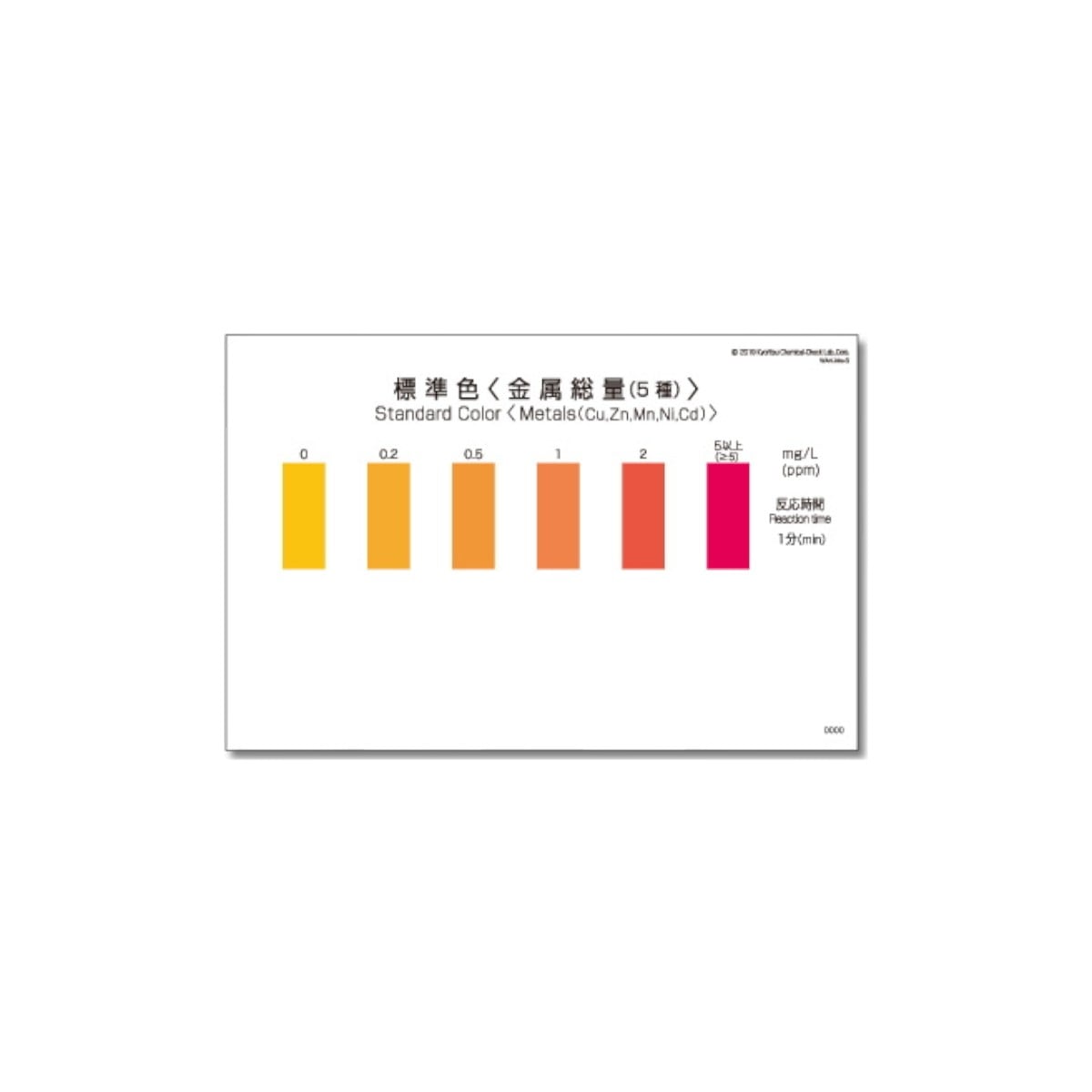 これら5種類の金属の有無を一度に確認できるため、環境水、用水などの異常の把握、緊急時のスクリーニング、廃水処理後の放流水の確認等に便利です。