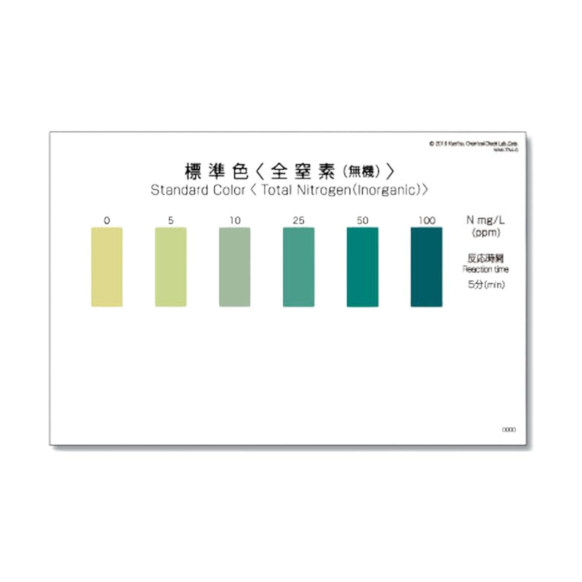 この製品では、検水中の硝酸態窒素(NO3--N)、亜硝酸態窒素(NO2--N)およびアンモニウム態窒素(NH4+-N)の合計値が得られます。
