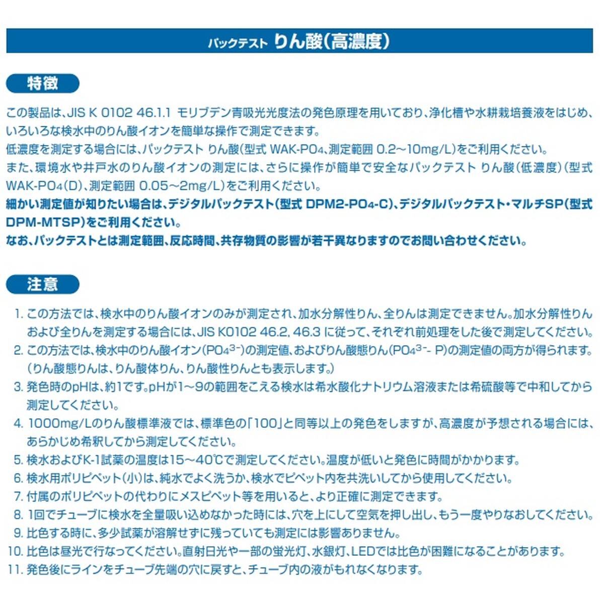 この製品は、浄化槽や水耕栽培溶液をはじめ、いろいろな検水中のりん酸イオン(PO43-)を簡単な操作で測定することができます。