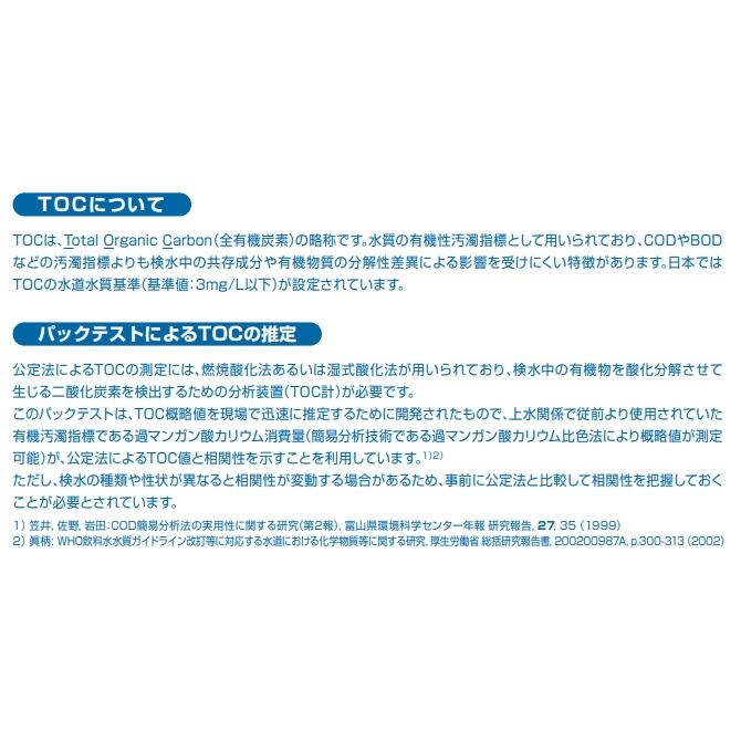 この製品は、検水中のTOC(全有機炭素)の概略値をパックテストで簡単に推定できるスクリーニングキットです。水道用水や工業用水、浴槽水などの管理にご利用いただけます。