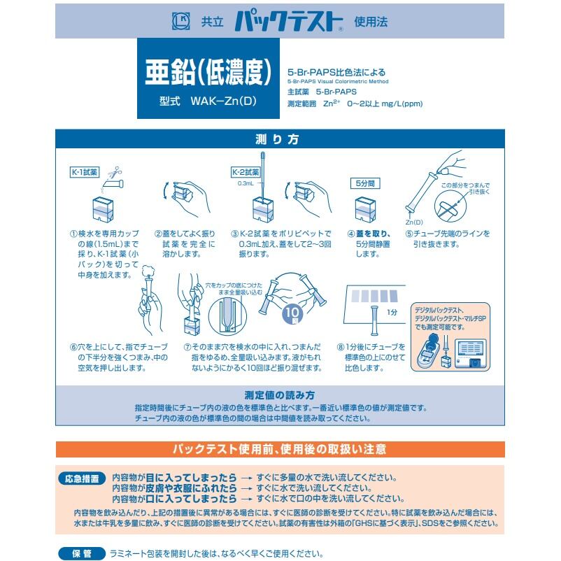 「パックテスト 亜鉛(低濃度) 1箱(40本) 外装箱あり」共立理化学研究所 簡易水質検査器具 水質測定器 水質検査キット 環境測定 現地調査 排水 管理 飲料水 検査 環境 調査 教材 教育 自由研究 養魚管理 水槽 水質事故調査 井戸水 河川