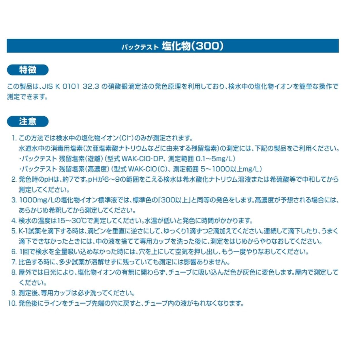 この製品は、検水中の塩化物イオン(Cl-)を簡単に測定することができます。