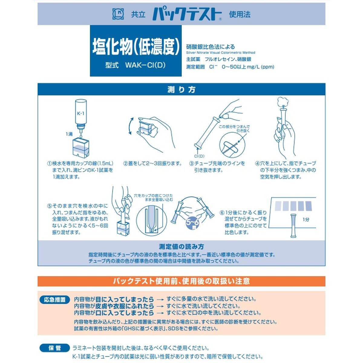 「パックテスト 塩化物(低濃度) 5本 前処理剤あり」 標準色なし 共立理化学研究所 簡易水質検査器具 水質測定器 水質検査キット 環境測定 現地調査 排水 管理 飲料水 検査 環境 調査教育 自由研究 養魚管理 水質事故調査 井戸水