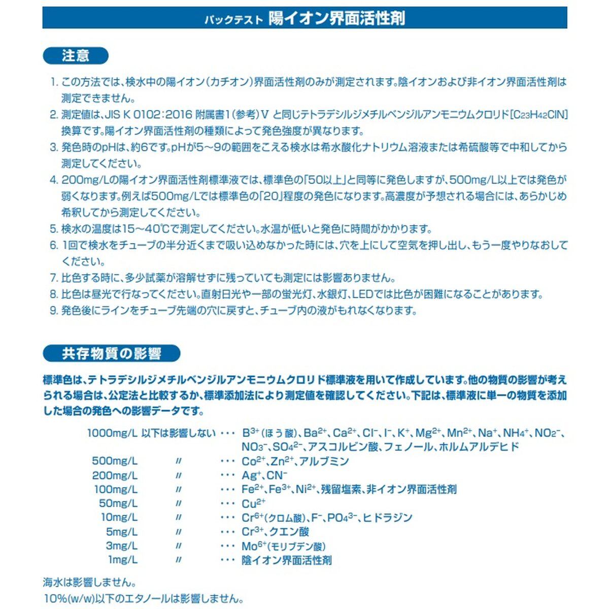 この製品は、いろいろな検水中の陽イオン界面活性剤を簡単な操作で測定することができます。