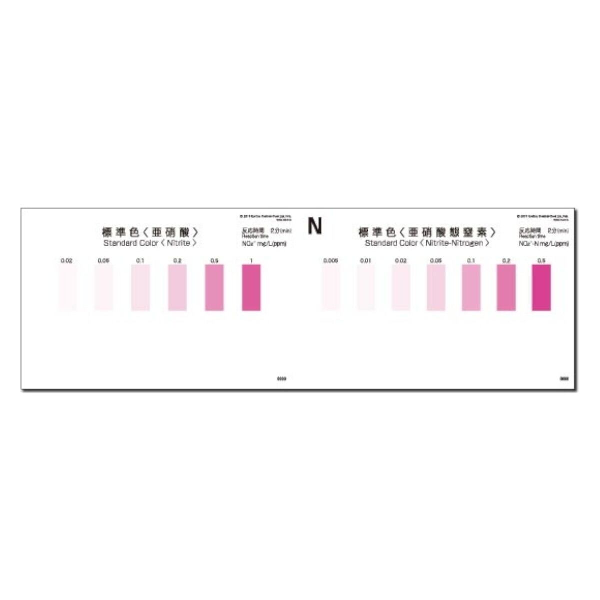 付属の標準色には、亜硝酸イオン、亜硝酸態窒素が別々に表記されています。測定する目的にあわせて、使い分けることができます。