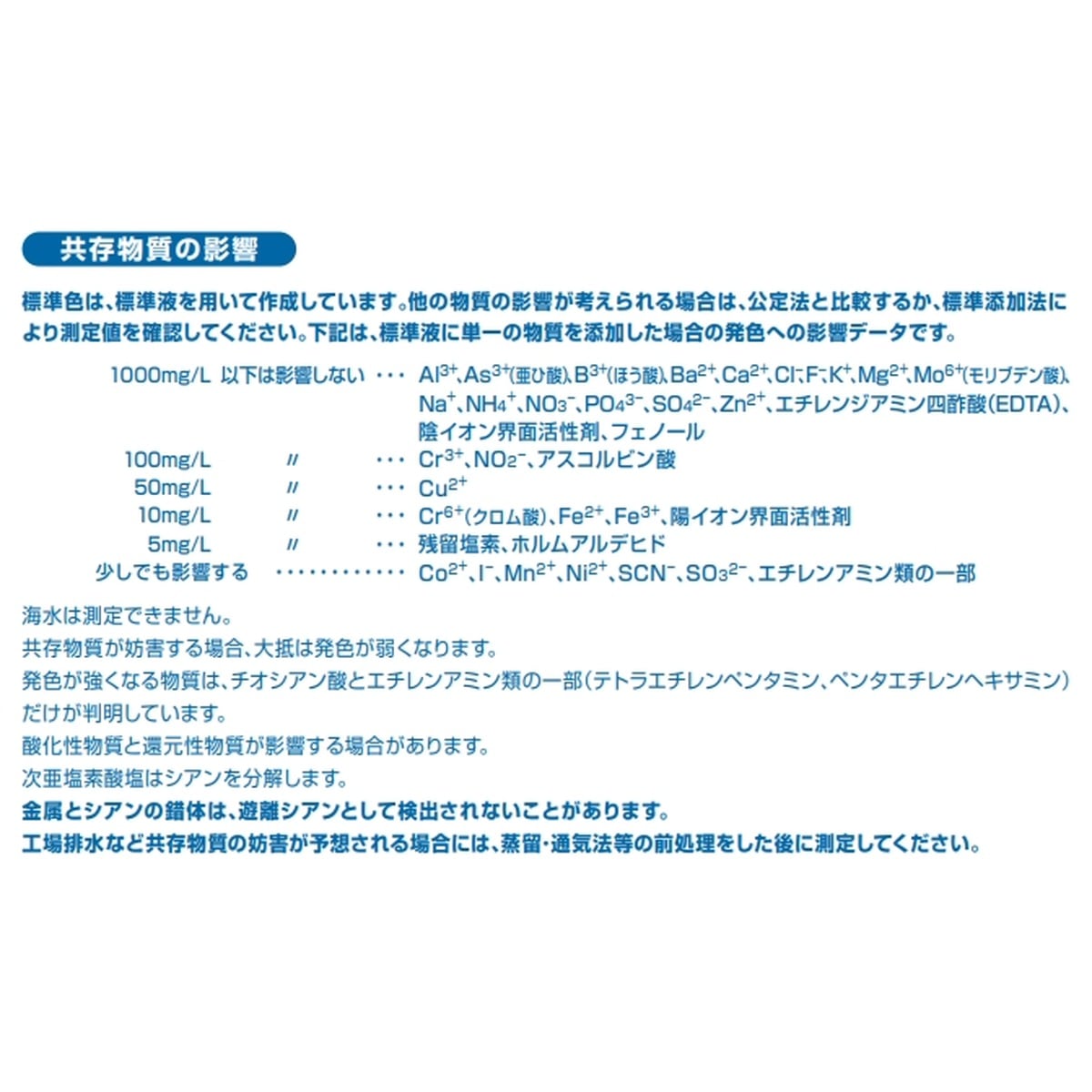 この製品は、工場排水や環境水をはじめ、いろいろな検水中の遊離シアン(シアン化物イオン)と塩化シアンを簡単な操作で測定することができます。