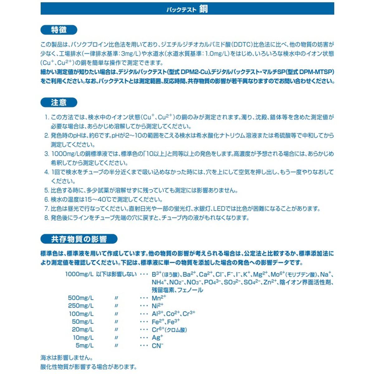 この製品は、工場排水や水道水をはじめ、いろいろな検水中のイオン状態の銅(Cu++Cu2+)を簡単な操作で測定することができます。