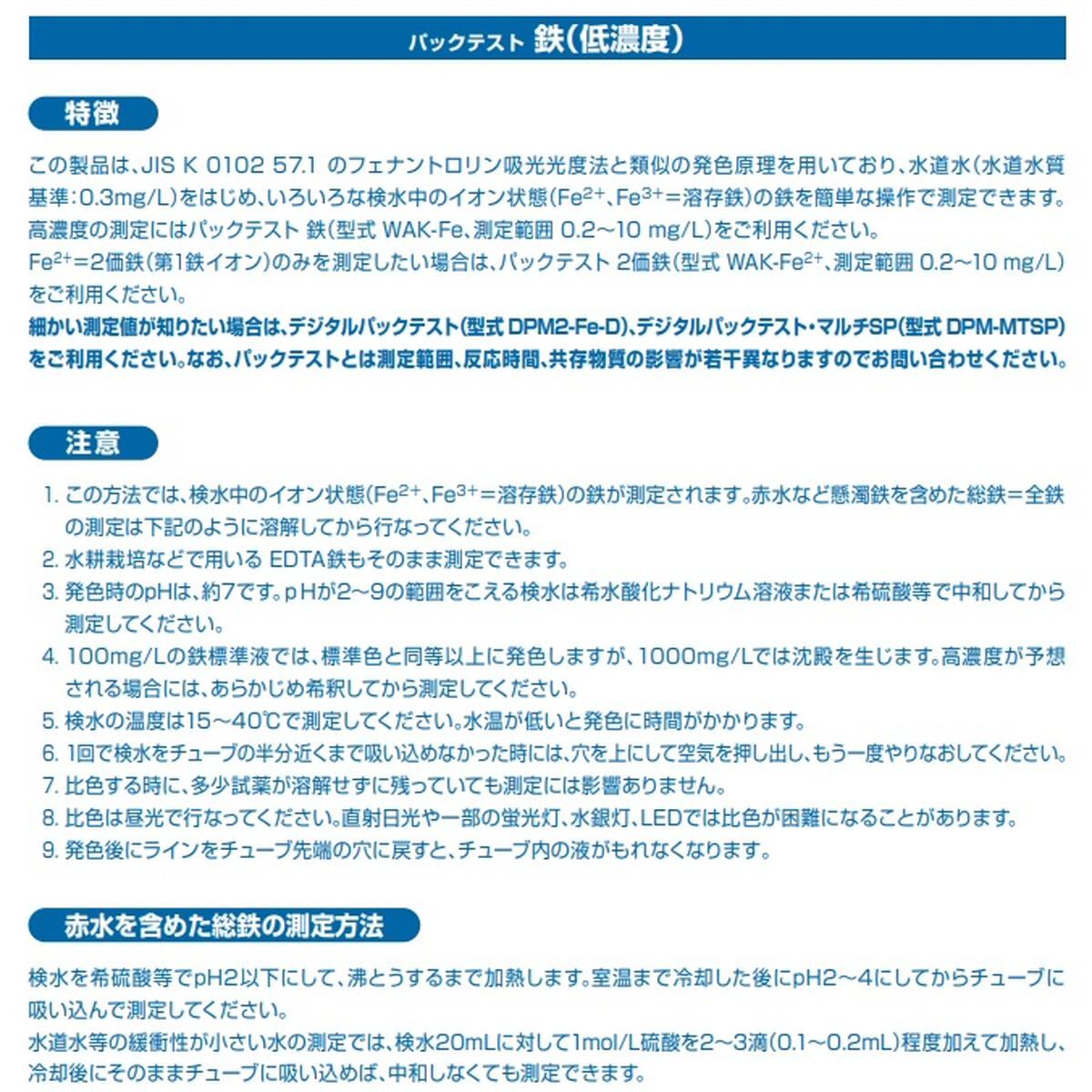 この製品は、水道水をはじめ、いろいろな検水中のイオン状態の鉄(Fe2++Fe3+)を簡単な操作で測定することができます。