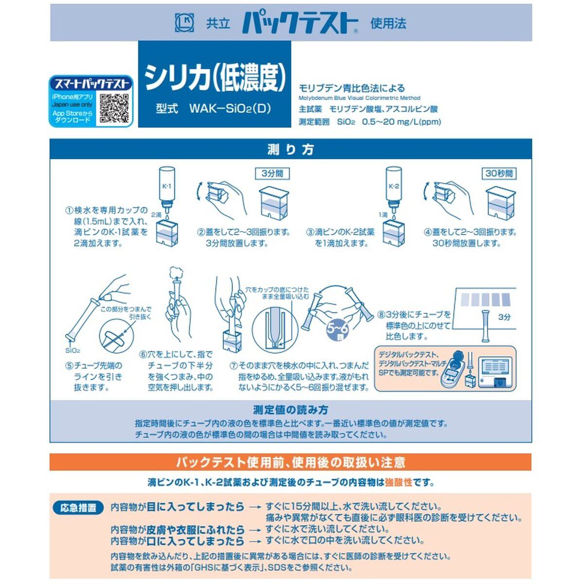 「パックテスト シリカ(低濃度) 1本 前処理剤あり」 標準色なし 共立理化学研究所 簡易水質検査器具 水質測定器 水質検査キット 環境測定 現地調査 排水 管理 飲料水 検査 環境 調査教育 自由研究 養魚管理 水質事故調査 井戸水