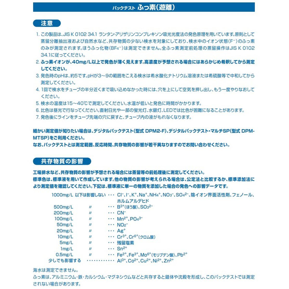 この製品は、検水中のイオン状態のふっ素(F-)を簡単に測定することができます。