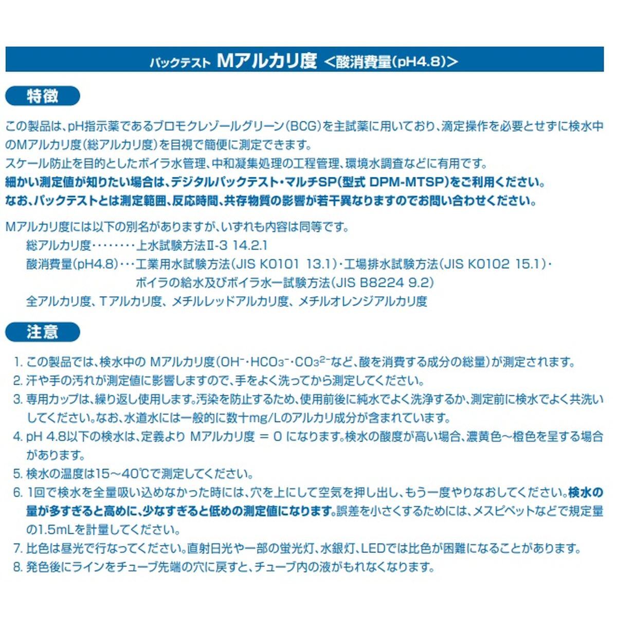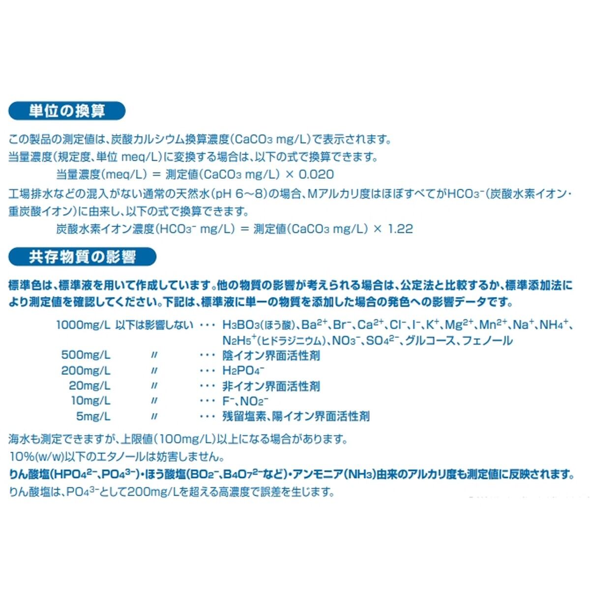この製品は、滴定操作を必要とせずに、検水中のMアルカリ度(総アルカリ度)を測定することができます。