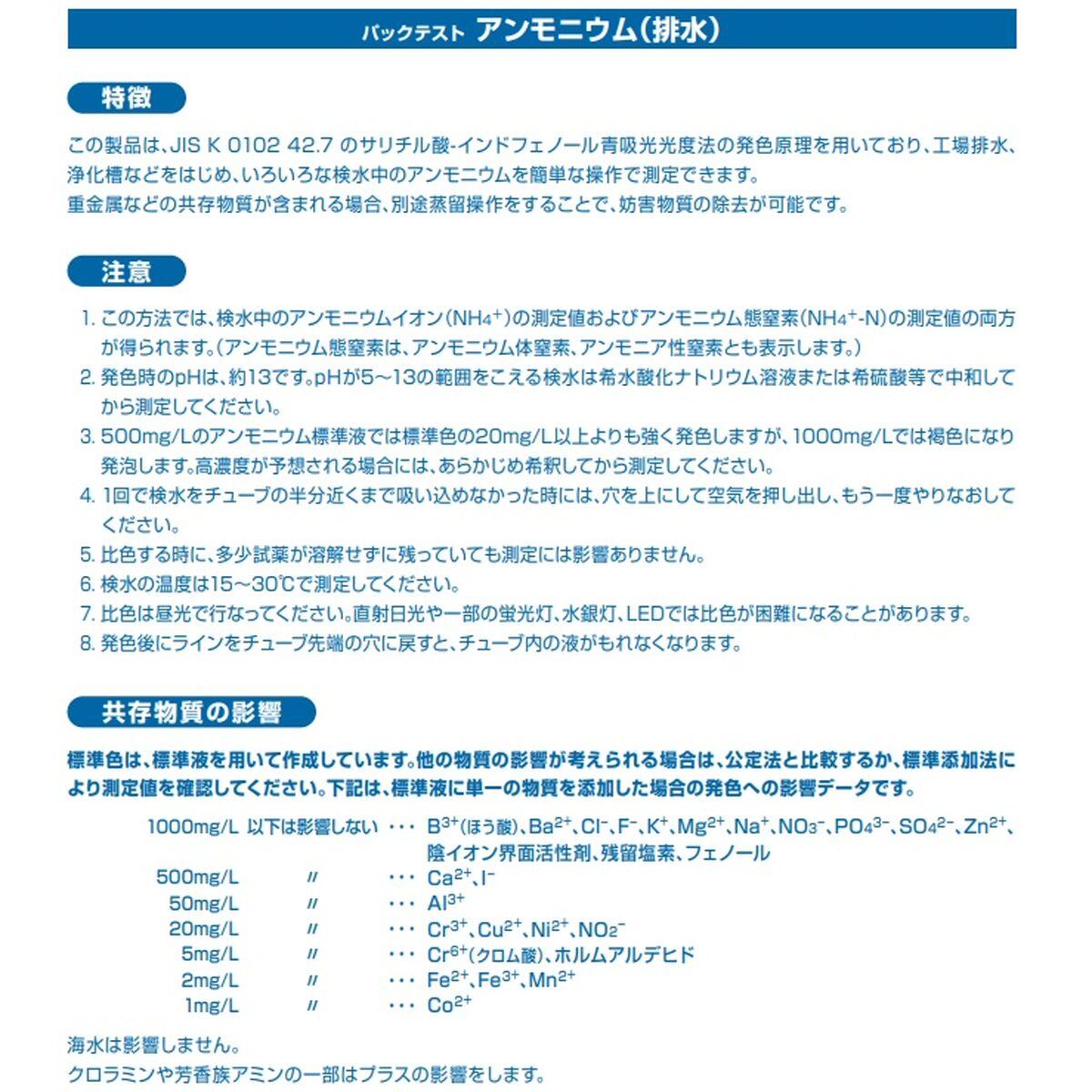 この製品は、工場排水、浄化槽などをはじめ、いろいろな検水中のアンモニウムイオン(NH4+)を測定することができます。