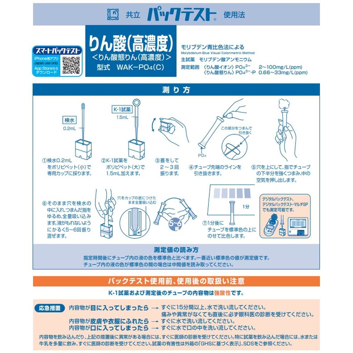 「パックテスト りん酸(高濃度) 10本 前処理剤あり」 標準色なし 共立理化学研究所 簡易水質検査器具 水質測定器 水質検査キット 環境測定 現地調査 排水 管理 飲料水 検査 環境 調査教育 自由研究 養魚管理 水質事故調査 井戸水