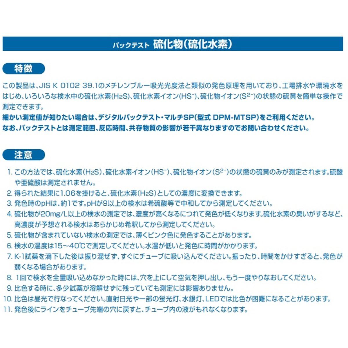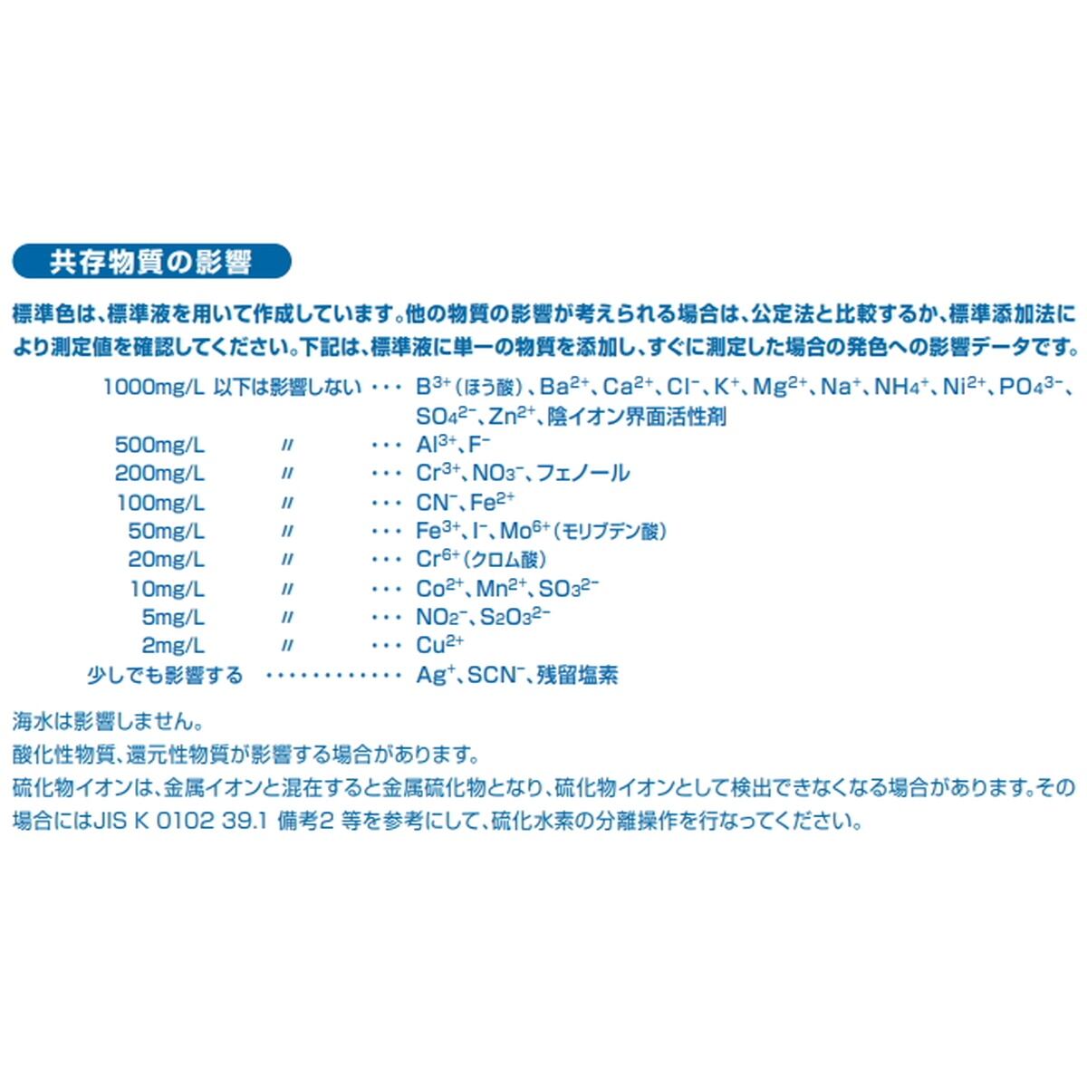 この製品は、工場排水や環境水をはじめ、いろいろな検水中の硫化水素(H2S)、硫化水素イオン(HS-)、硫化物イオン(S2-)の状態の硫黄を簡単な操作で測定することができます。