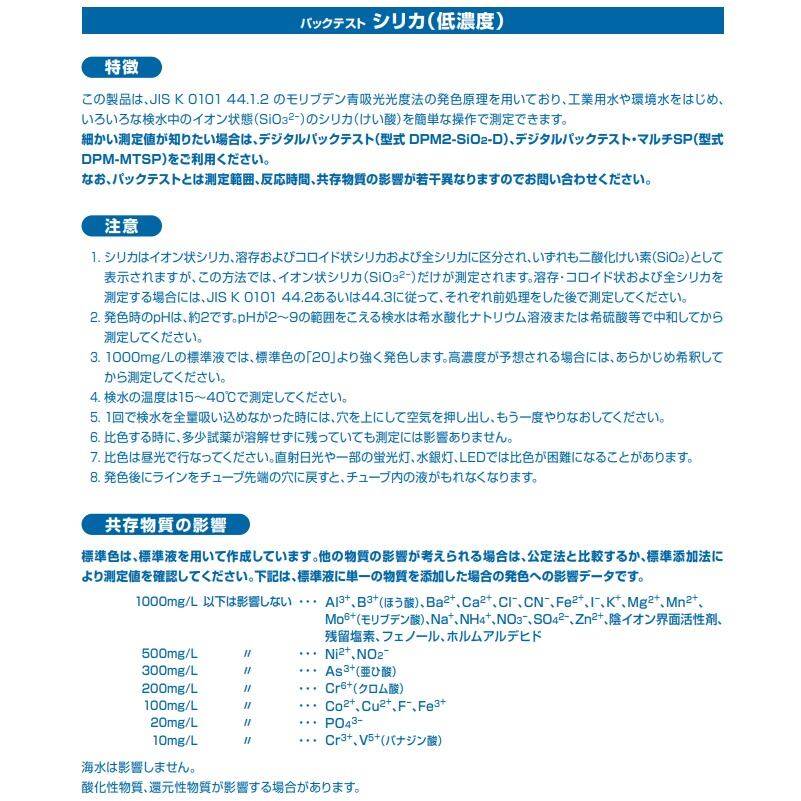 この製品は、工場排水や環境水をはじめ、いろいろな検水中のイオン状態のシリカ(SiO32-)を簡単な操作で測定することができます。