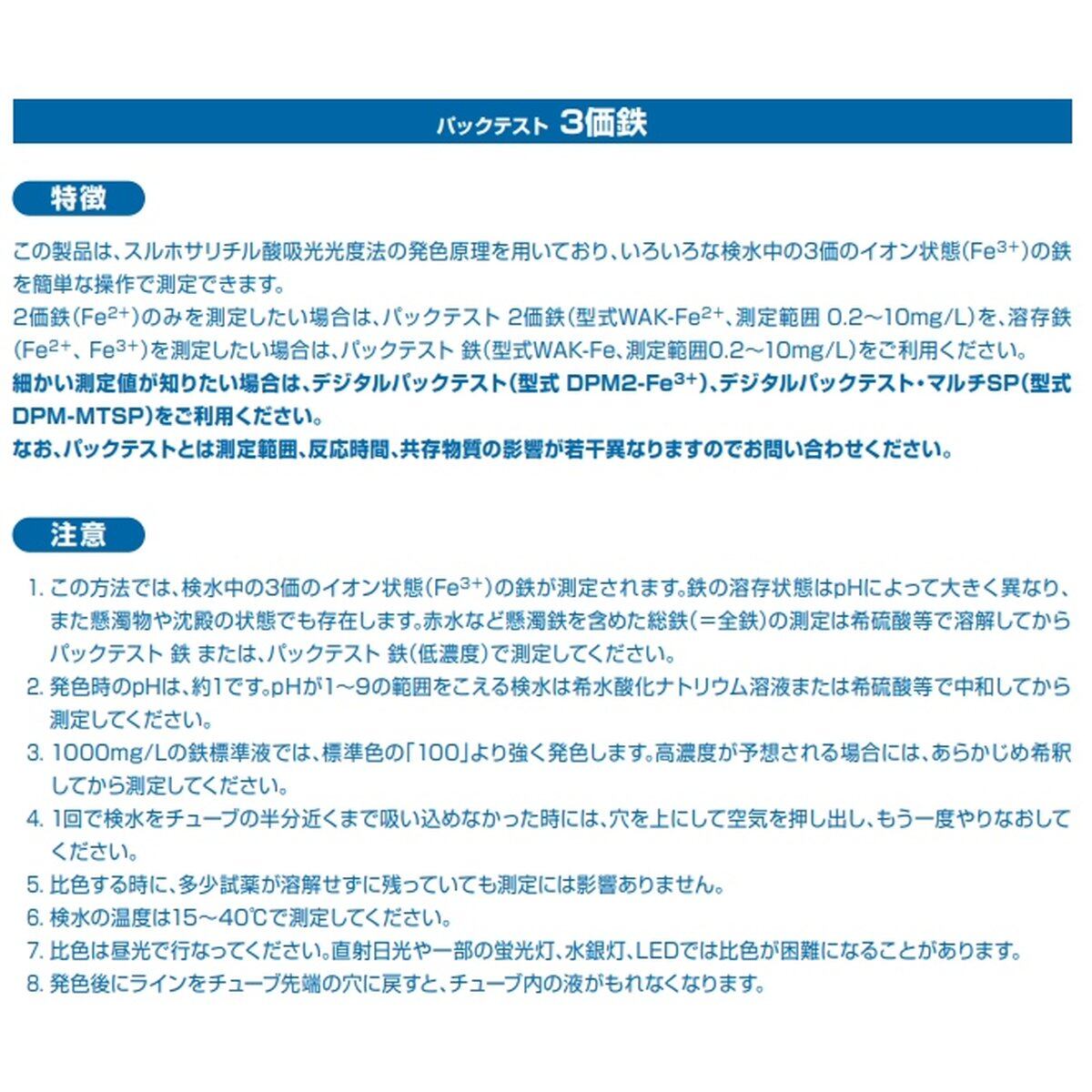 この製品は、いろいろな検水中の3価のイオン状態の 鉄(Fe3+)を簡単な操作で測定することができます。