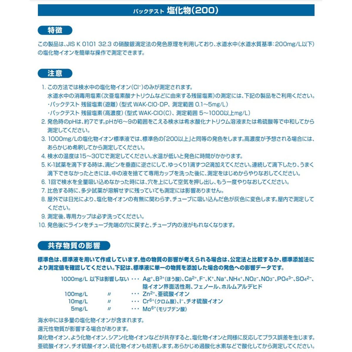 この製品は、検水中の塩化物イオン(Cl-)を簡単に測定することができます。