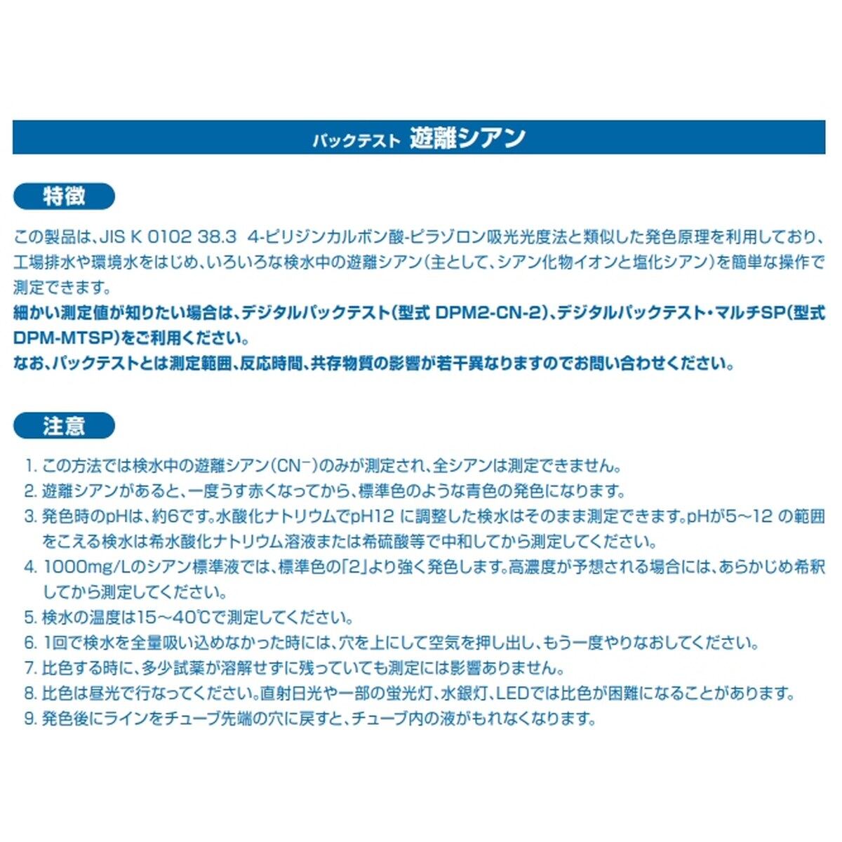 この製品は、工場排水や環境水をはじめ、いろいろな検水中の遊離シアン(シアン化物イオン)と塩化シアンを簡単な操作で測定することができます。