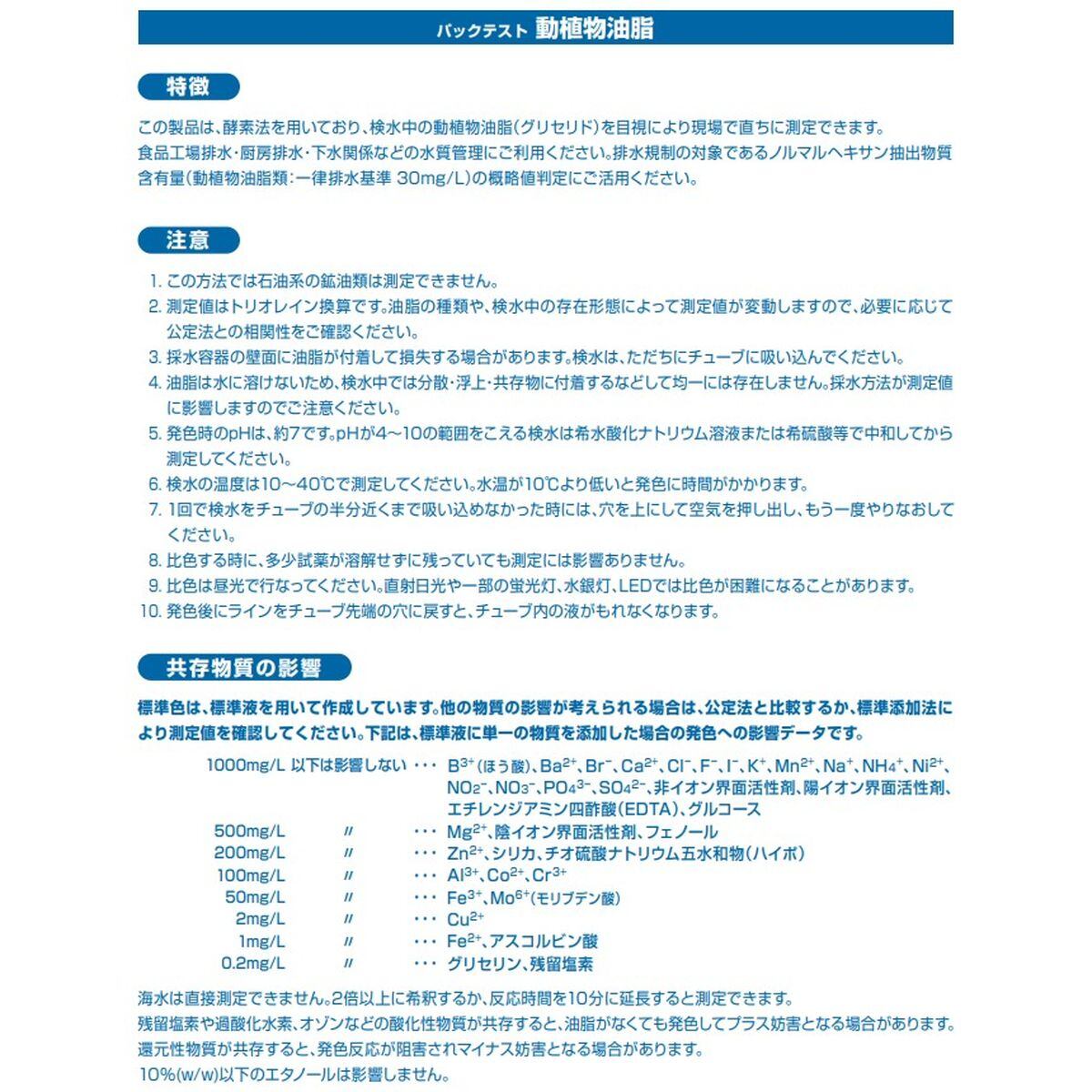 この製品は、検水中の動植物油脂濃度をパックテストで簡単に測定できるスクリーニングキットです。測定結果はノルマルヘキサン抽出物質(動植物油脂類含有量)の代替指標としてご活用ください。