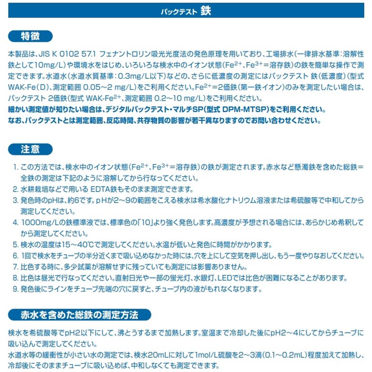 この製品は、工場排水や環境水をはじめ、いろいろな検水中のイオン状態の鉄(Fe2++Fe3+)を簡単な操作で測定することができます。