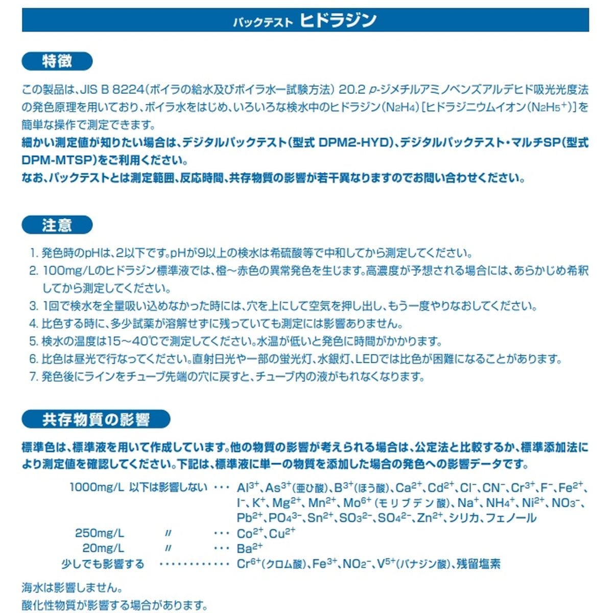 この製品は、ボイラ水をはじめ、いろいろな検水中のヒドラジン(N2H4)[ヒドラジニウムイオン(N2H5+)]を測定することができます。