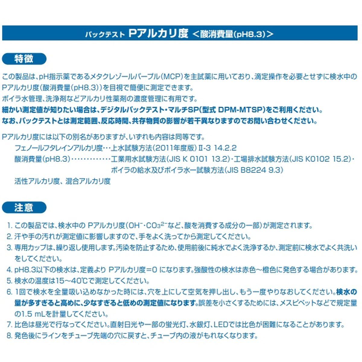 この製品は、滴定操作を必要とせずに、検水中のPアルカリ度(フェノールフタレインアルカリ度)を測定することができます。