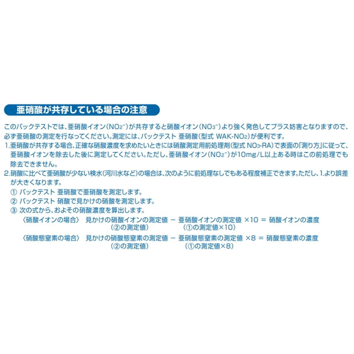 硝酸を測定する際に、亜硝酸が共存している場合は、測定に影響します。亜硝酸が共存する検水を測定する場合は下記の製品をご利用ください。
