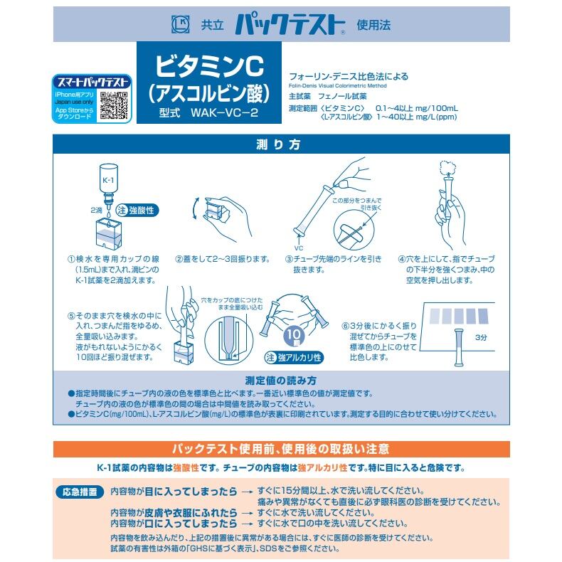 スマートパックテスト対応(測定範囲 ビタミンCとして 0.2 〜 1 mg/100mL)です。