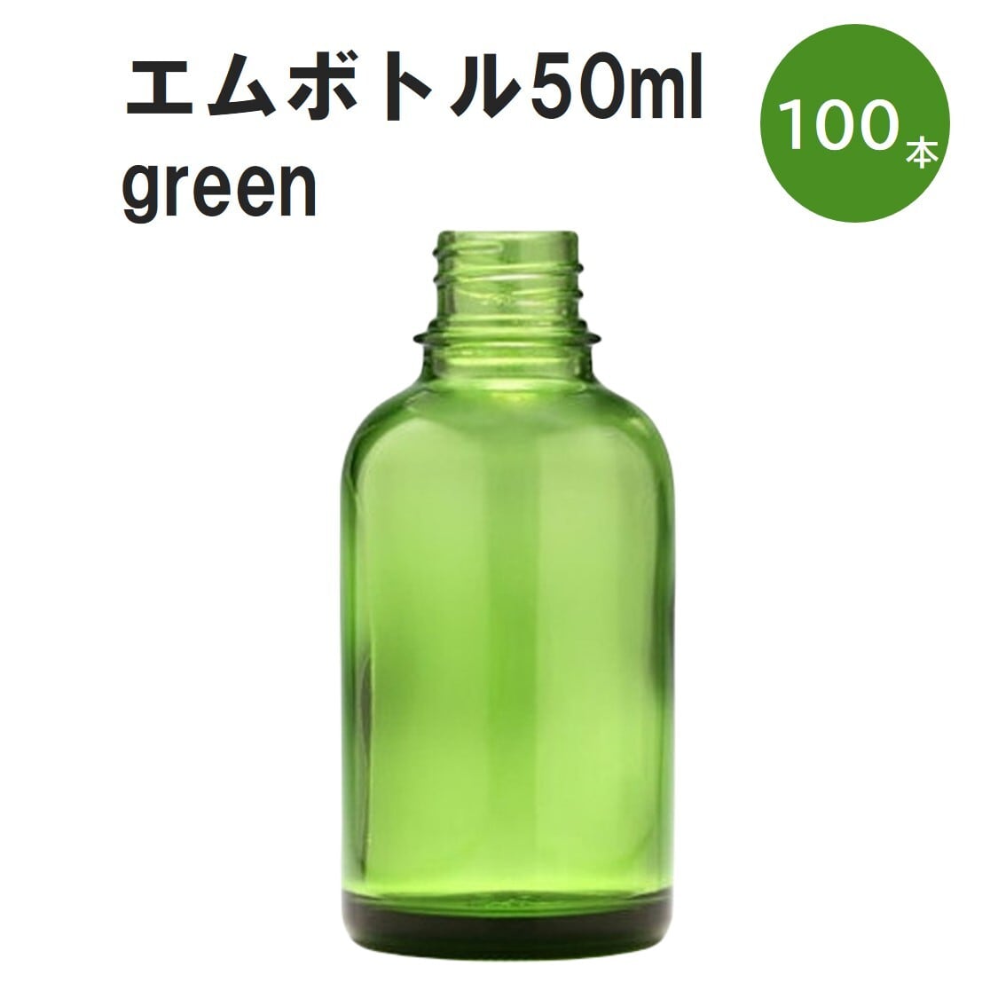 「グリーン エムボトルNo.50G 50ml キャップ アルミスクリューキャップ 100本 」 遮光ガラス瓶 小分け 詰め替え用 遮光瓶 詰め替え容器 空容器 保存用アロマ 手作りコスメ 精油 詰め替え 保存容器 ガラス瓶