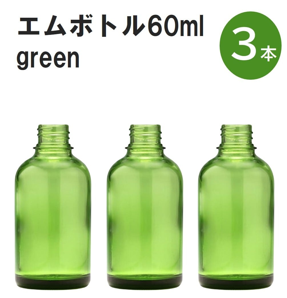 「グリーン エムボトルNo.60G 60ml キャップ アルミスクリューキャップ 3本 」 遮光ガラス瓶 小分け 詰め替え用 遮光瓶 詰め替え容器 空容器 保存用アロマ 手作りコスメ 精油 詰め替え 保存容器 ガラス瓶