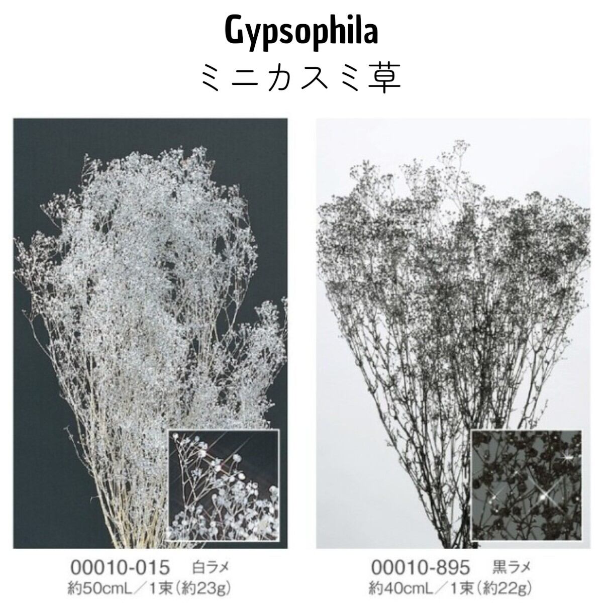 大地農園!プリザーブドフラワー「ミニカスミ草(ラメ付き) 黒ラメ 2g」 プリザ カスミ草 カスミソウ 花材 ハーバリウム おしゃれ かわいい プレゼント 贈り物 オオチノウエン 自然からの贈り物。大地農園プリザーブドフラワー! 00010-895 黒ラメきらめくラメをまとった、カスミ草。光を受けるたびに繊細に輝き、アレンジ全体をぐっと引き締めてくれます。●特徴・小ぶりで可愛いカスミ草です。・フォームを隠したり、ほかの花材の隙間に入れたりして、便利に使える定番のプリザーブドフラワーです。※配送の都合上、商品を箱に直接梱包することもございます。※なるべくふんわりと梱包いたしますが、配送による破損、潰れ、ほころびなどが生じることがございます。ご心配な方は宅配便をお選び下さい。※配送の都合上、使えない根元の部分はカットする場合があります。重量はカット前の重量となります。●注意事項※なるべくふんわりと梱包いたしますが、配送による破損、潰れ、ほころびなどが生じることがございます。ご心配な方は宅配便をご指定下さい。※配送の都合上、商品を箱に直接梱包することもございます。※高温多湿の場所では染料が切り口や表面からもれることがありますので、ご注意ください。※天然素材を使用している為、商品により色、サイズなど多少の違いが生じる場合がございます。※配送による破損、潰れが起こる場合がございますので、ご心配な方はメール便ではなく宅配便をお選びください。※配送の都合上、使えない根元の部分はカットする場合があります。重量はカット前の重量となります。※パッケージデザイン等が予告なく変更される場合もあります。※商品廃番・メーカー欠品など諸事情によりお届けできない場合がございます。※上記内容におけます返品交換は承れませんので、あらかじめご了承ください。取扱いの注意プリザーブドフラワーは湿気をとても嫌います。湿度の高い場所では枝や茎の切り口や表面から保存液や染料が染み出すことがあり、衣服などを汚す恐れがあります。ご使用の際には充分ご注意ください。 5