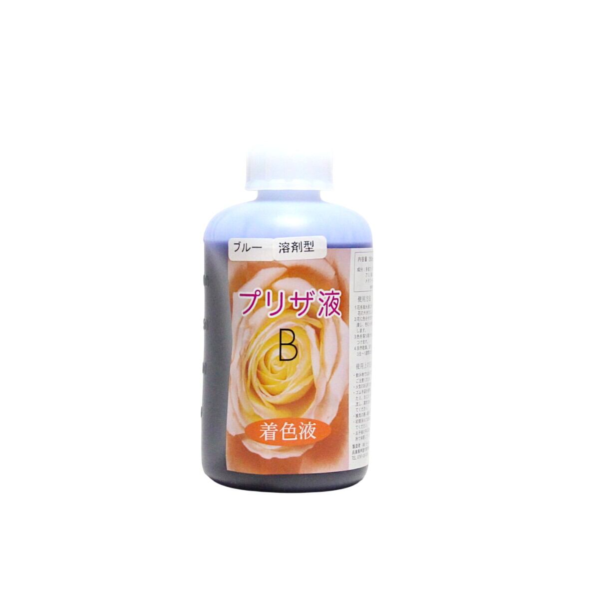 「プリザ液 B ブルー 溶剤 選べる容量 1本」 着色液 プリザーブドフラワー液 手作り 小花 葉物 手作り 花材 生花 資材 ハーバリウム オリジナルグッズ ハンドメイド デコレーション 脱水・脱色した花に着色を施し、長期保存可能にします。濃度が濃く、重厚感のある花材に仕上がります。 生花の美しさをそのまま長く楽しめるプリザーブドフラワーを、自分で作ってみませんか。B液は、A液で脱水・脱色したお花に色を与え長期間美しい状態を維持するための液です。※本商品だけではプリザーブドフラワーを作ることはできません。必ずA液と併用してください。●成分:多価アルコール、アルコール、水、アミノ酸、カチオン系色素、メタノール含有(第4類 第1石油類 水溶性 危険等級ll)火気厳禁●プリザ液 Aアルコールが主成分の脱水液で、花を浸けると水分と置き換わって脱水・脱色されます。2〜3回再使用できますが、花の水分で徐々に効果が弱まり、花が硬くならなくなったら交換してください。着色後の洗浄にも使えます。●プリザ液 B脱水・脱色後の花に色を定着させる液で、A液と同じく花内部の液体と置き換わる仕組みです。花の種類により5〜10回ほど再使用できます。B液には溶剤タイプと水性タイプがあり、同じタイプ同士なら混色できますが、異なるタイプは混ぜないでください。溶剤型:発色が濃く定着しやすい。初心者にも扱いやすい。水性型:淡くきれいな色が多いが、定着力は弱め。色を混ぜる際、同じ種類同士で薄い色に濃い色を足すと調整しやすくなります。クリアは溶剤・水性どちらにも使える薄め液で、脱色後の花をそのまま保存する際にも使用できます。着色液を薄めて好みの色を作ることもでき、B液の色を薄める場合は同シリーズのクリア(B・新B・特新B)をご使用ください。●B・新Bの違いB:基本の着色液。濃く定着しますが外側にも色が付きます。A液での洗浄が重要です。新B:分子が小さく、ムラなく染まりやすいです。乾きが早くベタつきも少ない一方で、やや色あせしやすい傾向があります。●プリザ液 A・B 使用方法(1) 花の準備・バラ、カーネーション、トルコキキョウなどが適しています。・鮮度のよい花を選び、水揚げをしておくと仕上がりがきれいになります。(2) A液で脱色する・容器に花全体が浸かる量のA液に入れ、ふたをします。・6時間〜7日ほど浸けて脱色します(花の種類や大きさで時間は変わります)。・十分色が抜けたら取り出します。・脱色後は花が硬くなります。(3) B液で着色する・別容器にB液を入れ、脱色した花を浸します。・形が崩れないように注意し、必要に応じて糸やワイヤーで固定します。・24時間以上浸け、ふたをしておきます。(4) A液で色を定着させる・B液から取り出した花を、A液に約5分浸して表面の液を落とします。・長時間浸すと色落ちするため注意が必要です。・なるべく新しいA液を使うと安心です。(5) 乾燥させて完成・直射日光を避け、乾燥台に置いて乾燥させます。・ペットボトルに穴を開けた台や卵パックなども利用できます。・乾燥日数は花の種類や大きさによって変わります。・電子レンジ、食器乾燥機、ドライヤーを使う方法もあります。・完成直後の花は柔らかく、軽く触れる程度なら問題ありません(押しすぎには注意してください)。●注意事項(液のお取り扱いについて)プリザーブドフラワー液はアルコールでできています。安全性は高いものですが、以下のことにご注意ください。エタノールが主成分であり、学校などでアルコールランプで利用されるものです。液を使用する際は十分換気してご使用ください。火気は絶対厳禁ですので、火の近くではご使用にならないでください。使用後の液を捨てるときには20倍以上に薄めて流してください。・使用時は必ず換気を行ってください・火気の近くでは絶対に使用しないでください・ゴム手袋を着用してください・換気の悪い場所での使用は避けてください・お子様の手の届かない冷暗所で保管してください・飲み物ではありませんので誤飲に注意してください・皮膚や目に付着した場合はすぐに水で洗い流し、異常があれば医師に相談してください・初期消火には粉末または泡消火器を使用してください 5