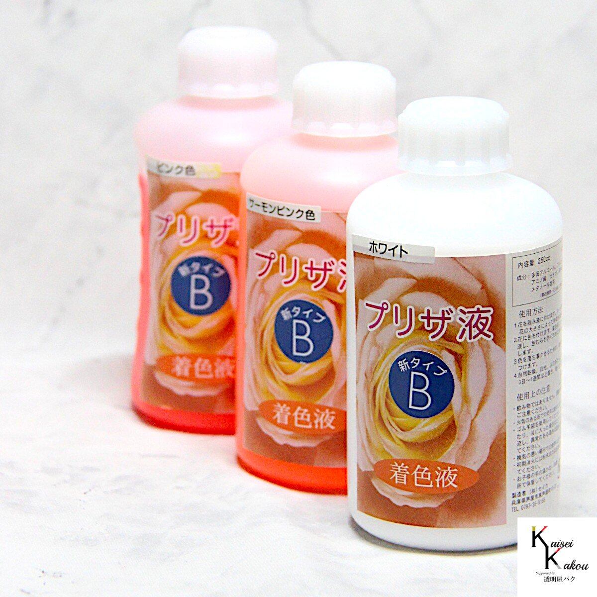 「プリザ液 新B 17色セット 水性 溶剤 250cc 各1本」 「クリア ホワイト レッド ワイン ピンク サーモンピンク オレンジ グリーン イエロー レモンイエロー ブルー ダークブルー スカイブルー バイオレット レッドパープル ブラウン ブラック」着色液 プリザーブドフラワー液 脱水・脱色した花に着色を施し、長期保存可能にします。ムラなく染まり、速乾でベタつきを抑えた新タイプ。 生花の美しさをそのまま長く楽しめるプリザーブドフラワーを、自分で作ってみませんか。B液は、A液で脱水・脱色したお花に色を与え長期間美しい状態を維持するための液です。●新B 全17色セットクリア、ホワイト、レッド、ワイン、ピンク、サーモンピンク、オレンジ、グリーン、イエロー、レモンイエロー、ブルー、ダークブルー、スカイブルー、バイオレット、レッドパープル、ブラウン、ブラック※本商品だけではプリザーブドフラワーを作ることはできません。必ずA液と併用してください。●成分:多価アルコール、アルコール、水、アミノ酸、カチオン系色素、メタノール含有(第4類 第1石油類 水溶性 危険等級ll)火気厳禁●プリザ液 Aアルコールが主成分の脱水液で、花を浸けると水分と置き換わって脱水・脱色されます。2〜3回再使用できますが、花の水分で徐々に効果が弱まり、花が硬くならなくなったら交換してください。着色後の洗浄にも使えます。●プリザ液 B脱水・脱色後の花に色を定着させる液で、A液と同じく花内部の液体と置き換わる仕組みです。花の種類により5〜10回ほど再使用できます。B液には溶剤タイプと水性タイプがあり、同じタイプ同士なら混色できますが、異なるタイプは混ぜないでください。溶剤系:発色が濃く定着しやすい。初心者にも扱いやすい。水性系:淡くきれいな色が多いが、定着力は弱め。色を混ぜる際、同じ種類同士で薄い色に濃い色を足すと調整しやすくなります。クリアは溶剤・水性どちらにも使える薄め液で、脱色後の花をそのまま保存する際にも使用できます。着色液を薄めて好みの色を作ることもでき、B液の色を薄める場合は同シリーズのクリア(B・新B・特新B)をご使用ください。●B・新Bの違いB:基本の着色液。濃く定着しますが外側にも色が付きます。A液での洗浄が重要です。新B:分子が小さく、ムラなく染まりやすいです。乾きが早くベタつきも少ない一方で、やや色あせしやすい傾向があります。●プリザ液 A・B 使用方法(1) 花の準備・バラ、カーネーション、トルコキキョウなどが適しています。・鮮度のよい花を選び、水揚げをしておくと仕上がりがきれいになります。(2) A液で脱色する・容器に花全体が浸かる量のA液に入れ、ふたをします。・6時間〜7日ほど浸けて脱色します(花の種類や大きさで時間は変わります)。・十分色が抜けたら取り出します。・脱色後は花が硬くなります。(3) B液で着色する・別容器にB液を入れ、脱色した花を浸します。・形が崩れないように注意し、必要に応じて糸やワイヤーで固定します。・24時間以上浸け、ふたをしておきます。(4) A液で色を定着させる・B液から取り出した花を、A液に約5分浸して表面の液を落とします。・長時間浸すと色落ちするため注意が必要です。・なるべく新しいA液を使うと安心です。(5) 乾燥させて完成・直射日光を避け、乾燥台に置いて乾燥させます。・ペットボトルに穴を開けた台や卵パックなども利用できます。・乾燥日数は花の種類や大きさによって変わります。・電子レンジ、食器乾燥機、ドライヤーを使う方法もあります。・完成直後の花は柔らかく、軽く触れる程度なら問題ありません(押しすぎには注意してください)。●注意事項(液のお取り扱いについて)プリザーブドフラワー液はアルコールでできています。安全性は高いものですが、以下のことにご注意ください。エタノールが主成分であり、学校などでアルコールランプで利用されるものです。液を使用する際は十分換気してご使用ください。火気は絶対厳禁ですので、火の近くではご使用にならないでください。使用後の液を捨てるときには20倍以上に薄めて流してください。・使用時は必ず換気を行ってください・火気の近くでは絶対に使用しないでください・ゴム手袋を着用してください・換気の悪い場所での使用は避けてください・お子様の手の届かない冷暗所で保管してください・飲み物ではありませんので誤飲に注意してください・皮膚や目に付着した場合はすぐに水で洗い流し、異常があれば医師に相談してください・初期消火には粉末または泡消火器を使用してください 5