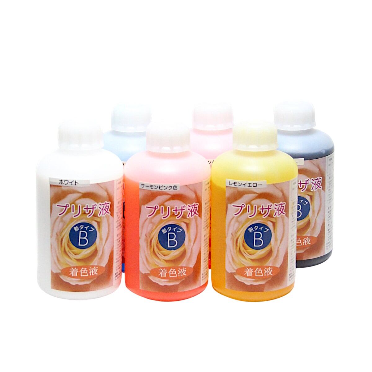「プリザ液 新B 水性 6色セット 250cc 各1本ずつ」 「ホワイト ピンク サーモンピンク レモンイエロー ダークブルー スカイブルー」 着色液 プリザーブドフラワー液 手作り 小花 葉物 手作り 花材 生花 資材 ハーバリウム オリジナルグッズ ハンドメイド