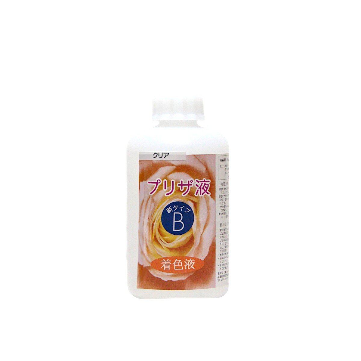 「プリザ液 新B クリア 250cc 1本」 着色液 プリザーブドフラワー液 手作り 小花 葉物 手作り 花材 生花 資材 ハーバリウム オリジナルグッズ ハンドメイド デコレーション 脱水・脱色した花を、長期保存可能にします。着色液を薄めて、お好みの色を作ることもできます。 生花の美しさをそのまま長く楽しめるプリザーブドフラワーを、自分で作ってみませんか。B液は、A液で脱水・脱色したお花に色を与え長期間美しい状態を維持するための液です。※本商品だけではプリザーブドフラワーを作ることはできません。必ずA液と併用してください。●成分:多価アルコール、アルコール、水、アミノ酸、カチオン系色素、メタノール含有(第4類 第1石油類 水溶性 危険等級ll)火気厳禁●プリザ液 Aアルコールが主成分の脱水液で、花を浸けると水分と置き換わって脱水・脱色されます。2〜3回再使用できますが、花の水分で徐々に効果が弱まり、花が硬くならなくなったら交換してください。着色後の洗浄にも使えます。●プリザ液 B脱水・脱色後の花に色を定着させる液で、A液と同じく花内部の液体と置き換わる仕組みです。花の種類により5〜10回ほど再使用できます。B液には溶剤タイプと水性タイプがあり、同じタイプ同士なら混色できますが、異なるタイプは混ぜないでください。溶剤系:発色が濃く定着しやすい。初心者にも扱いやすい。水性系:淡くきれいな色が多いが、定着力は弱め。色を混ぜる際、同じ種類同士で薄い色に濃い色を足すと調整しやすくなります。クリアは溶剤・水性どちらにも使える薄め液で、脱色後の花をそのまま保存する際にも使用できます。着色液を薄めて好みの色を作ることもでき、B液の色を薄める場合は同シリーズのクリア(B・新B・特新B)をご使用ください。●B・新Bの違いB:基本の着色液。濃く定着しますが外側にも色が付きます。A液での洗浄が重要です。新B:分子が小さく、ムラなく染まりやすいです。乾きが早くベタつきも少ない一方で、やや色あせしやすい傾向があります。●プリザ液 A・B 使用方法(1) 花の準備・バラ、カーネーション、トルコキキョウなどが適しています。・鮮度のよい花を選び、水揚げをしておくと仕上がりがきれいになります。(2) A液で脱色する・容器に花全体が浸かる量のA液に入れ、ふたをします。・6時間〜7日ほど浸けて脱色します(花の種類や大きさで時間は変わります)。・十分色が抜けたら取り出します。・脱色後は花が硬くなります。(3) B液で着色する・別容器にB液を入れ、脱色した花を浸します。・形が崩れないように注意し、必要に応じて糸やワイヤーで固定します。・24時間以上浸け、ふたをしておきます。(4) A液で色を定着させる・B液から取り出した花を、A液に約5分浸して表面の液を落とします。・長時間浸すと色落ちするため注意が必要です。・なるべく新しいA液を使うと安心です。(5) 乾燥させて完成・直射日光を避け、乾燥台に置いて乾燥させます。・ペットボトルに穴を開けた台や卵パックなども利用できます。・乾燥日数は花の種類や大きさによって変わります。・電子レンジ、食器乾燥機、ドライヤーを使う方法もあります。・完成直後の花は柔らかく、軽く触れる程度なら問題ありません(押しすぎには注意してください)。●注意事項(液のお取り扱いについて)プリザーブドフラワー液はアルコールでできています。安全性は高いものですが、以下のことにご注意ください。エタノールが主成分であり、学校などでアルコールランプで利用されるものです。液を使用する際は十分換気してご使用ください。火気は絶対厳禁ですので、火の近くではご使用にならないでください。使用後の液を捨てるときには20倍以上に薄めて流してください。・使用時は必ず換気を行ってください・火気の近くでは絶対に使用しないでください・ゴム手袋を着用してください・換気の悪い場所での使用は避けてください・お子様の手の届かない冷暗所で保管してください・飲み物ではありませんので誤飲に注意してください・皮膚や目に付着した場合はすぐに水で洗い流し、異常があれば医師に相談してください・初期消火には粉末または泡消火器を使用してください 5