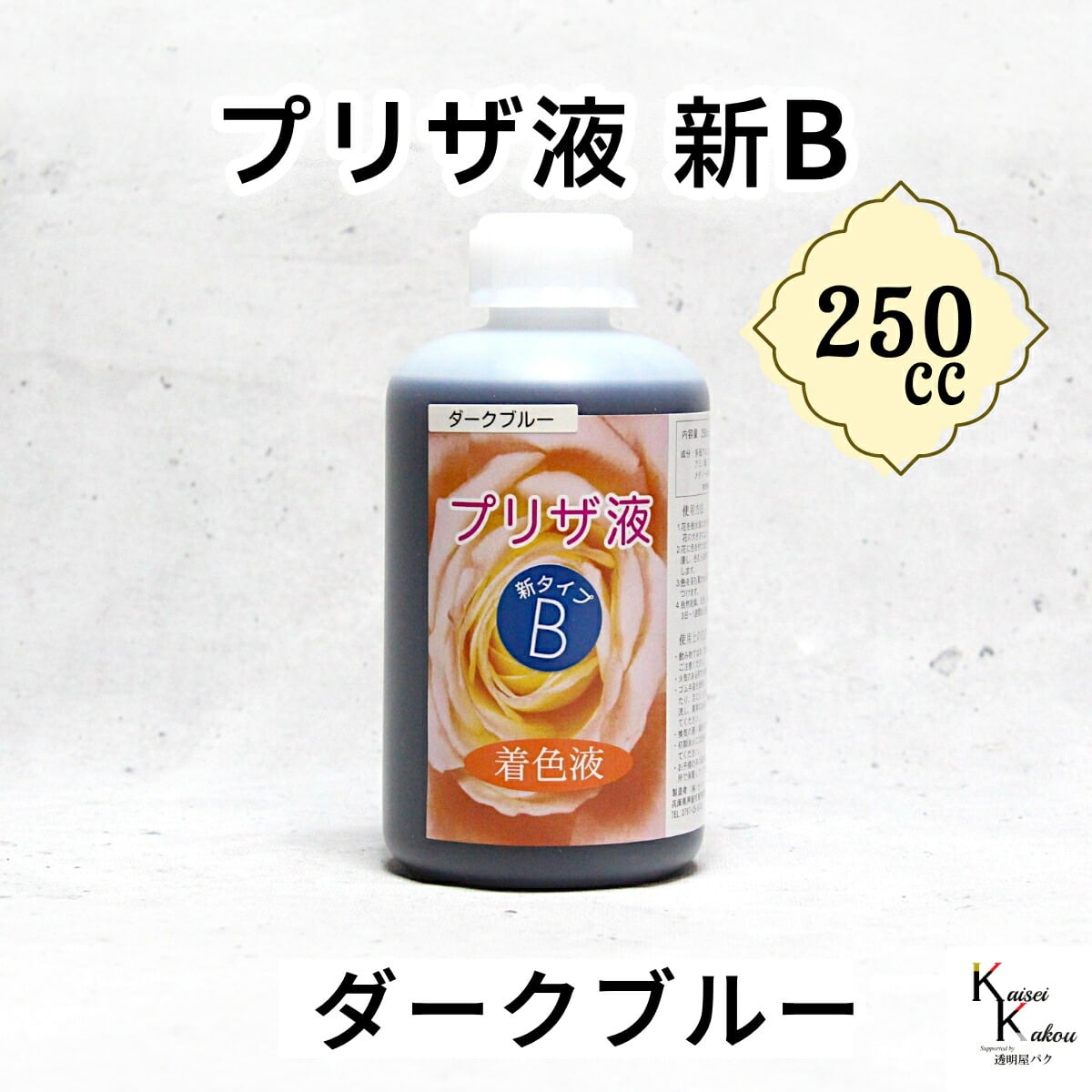「プリザ液 新B ダークブルー 水性 250cc 1本」 着色液 プリザーブドフラワー液 手作り 小花 葉物 手作り 花材 生花 資材 ハーバリウム オリジナルグッズ ハンドメイド デコレーション 脱水・脱色した花に着色を施し、長期保存可能にします。ムラなく染まり、速乾でベタつきを抑えた新タイプ。 生花の美しさをそのまま長く楽しめるプリザーブドフラワーを、自分で作ってみませんか。B液は、A液で脱水・脱色したお花に色を与え長期間美しい状態を維持するための液です。※本商品だけではプリザーブドフラワーを作ることはできません。必ずA液と併用してください。●成分:多価アルコール、アルコール、水、アミノ酸、カチオン系色素、メタノール含有(第4類 第1石油類 水溶性 危険等級ll)火気厳禁●プリザ液 Aアルコールが主成分の脱水液で、花を浸けると水分と置き換わって脱水・脱色されます。2〜3回再使用できますが、花の水分で徐々に効果が弱まり、花が硬くならなくなったら交換してください。着色後の洗浄にも使えます。●プリザ液 B脱水・脱色後の花に色を定着させる液で、A液と同じく花内部の液体と置き換わる仕組みです。花の種類により5〜10回ほど再使用できます。B液には溶剤タイプと水性タイプがあり、同じタイプ同士なら混色できますが、異なるタイプは混ぜないでください。溶剤系:発色が濃く定着しやすい。初心者にも扱いやすい。水性系:淡くきれいな色が多いが、定着力は弱め。色を混ぜる際、同じ種類同士で薄い色に濃い色を足すと調整しやすくなります。クリアは溶剤・水性どちらにも使える薄め液で、脱色後の花をそのまま保存する際にも使用できます。着色液を薄めて好みの色を作ることもでき、B液の色を薄める場合は同シリーズのクリア(B・新B・特新B)をご使用ください。●B・新Bの違いB:基本の着色液。濃く定着しますが外側にも色が付きます。A液での洗浄が重要です。新B:分子が小さく、ムラなく染まりやすいです。乾きが早くベタつきも少ない一方で、やや色あせしやすい傾向があります。●プリザ液 A・B 使用方法(1) 花の準備・バラ、カーネーション、トルコキキョウなどが適しています。・鮮度のよい花を選び、水揚げをしておくと仕上がりがきれいになります。(2) A液で脱色する・容器に花全体が浸かる量のA液に入れ、ふたをします。・6時間〜7日ほど浸けて脱色します(花の種類や大きさで時間は変わります)。・十分色が抜けたら取り出します。・脱色後は花が硬くなります。(3) B液で着色する・別容器にB液を入れ、脱色した花を浸します。・形が崩れないように注意し、必要に応じて糸やワイヤーで固定します。・24時間以上浸け、ふたをしておきます。(4) A液で色を定着させる・B液から取り出した花を、A液に約5分浸して表面の液を落とします。・長時間浸すと色落ちするため注意が必要です。・なるべく新しいA液を使うと安心です。(5) 乾燥させて完成・直射日光を避け、乾燥台に置いて乾燥させます。・ペットボトルに穴を開けた台や卵パックなども利用できます。・乾燥日数は花の種類や大きさによって変わります。・電子レンジ、食器乾燥機、ドライヤーを使う方法もあります。・完成直後の花は柔らかく、軽く触れる程度なら問題ありません(押しすぎには注意してください)。●注意事項(液のお取り扱いについて)プリザーブドフラワー液はアルコールでできています。安全性は高いものですが、以下のことにご注意ください。エタノールが主成分であり、学校などでアルコールランプで利用されるものです。液を使用する際は十分換気してご使用ください。火気は絶対厳禁ですので、火の近くではご使用にならないでください。使用後の液を捨てるときには20倍以上に薄めて流してください。・使用時は必ず換気を行ってください・火気の近くでは絶対に使用しないでください・ゴム手袋を着用してください・換気の悪い場所での使用は避けてください・お子様の手の届かない冷暗所で保管してください・飲み物ではありませんので誤飲に注意してください・皮膚や目に付着した場合はすぐに水で洗い流し、異常があれば医師に相談してください・初期消火には粉末または泡消火器を使用してください 5
