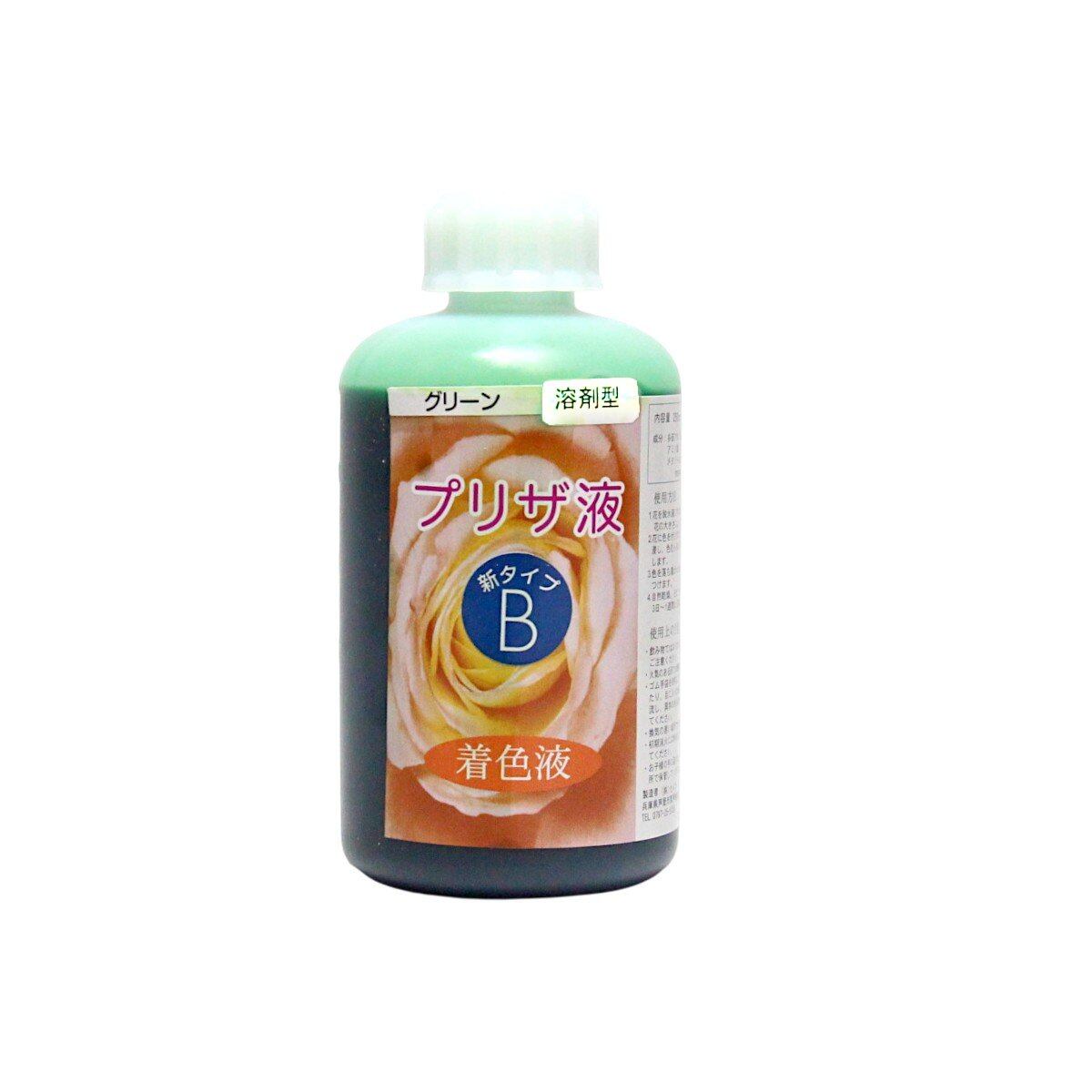 「プリザ液 新B グリーン 溶剤 4リットル 1本」 4L 着色液 プリザーブドフラワー液 手作り 小花 葉物 手作り 花材 生花 資材 ハーバリウム オリジナルグッズ ハンドメイド デコレーション 脱水・脱色した花に着色を施し、長期保存可能にします。ムラなく染まり、速乾でベタつきを抑えた新タイプ。 生花の美しさをそのまま長く楽しめるプリザーブドフラワーを、自分で作ってみませんか。B液は、A液で脱水・脱色したお花に色を与え長期間美しい状態を維持するための液です。※本商品だけではプリザーブドフラワーを作ることはできません。必ずA液と併用してください。●成分:多価アルコール、アルコール、水、アミノ酸、カチオン系色素、メタノール含有(第4類 第1石油類 水溶性 危険等級ll)火気厳禁●プリザ液 Aアルコールが主成分の脱水液で、花を浸けると水分と置き換わって脱水・脱色されます。2〜3回再使用できますが、花の水分で徐々に効果が弱まり、花が硬くならなくなったら交換してください。着色後の洗浄にも使えます。●プリザ液 B脱水・脱色後の花に色を定着させる液で、A液と同じく花内部の液体と置き換わる仕組みです。花の種類により5〜10回ほど再使用できます。B液には溶剤タイプと水性タイプがあり、同じタイプ同士なら混色できますが、異なるタイプは混ぜないでください。溶剤系:発色が濃く定着しやすい。初心者にも扱いやすい。水性系:淡くきれいな色が多いが、定着力は弱め。色を混ぜる際、同じ種類同士で薄い色に濃い色を足すと調整しやすくなります。クリアは溶剤・水性どちらにも使える薄め液で、脱色後の花をそのまま保存する際にも使用できます。着色液を薄めて好みの色を作ることもでき、B液の色を薄める場合は同シリーズのクリア(B・新B・特新B)をご使用ください。●B・新Bの違いB:基本の着色液。濃く定着しますが外側にも色が付きます。A液での洗浄が重要です。新B:分子が小さく、ムラなく染まりやすいです。乾きが早くベタつきも少ない一方で、やや色あせしやすい傾向があります。●プリザ液 A・B 使用方法(1) 花の準備・バラ、カーネーション、トルコキキョウなどが適しています。・鮮度のよい花を選び、水揚げをしておくと仕上がりがきれいになります。(2) A液で脱色する・容器に花全体が浸かる量のA液に入れ、ふたをします。・6時間〜7日ほど浸けて脱色します(花の種類や大きさで時間は変わります)。・十分色が抜けたら取り出します。・脱色後は花が硬くなります。(3) B液で着色する・別容器にB液を入れ、脱色した花を浸します。・形が崩れないように注意し、必要に応じて糸やワイヤーで固定します。・24時間以上浸け、ふたをしておきます。(4) A液で色を定着させる・B液から取り出した花を、A液に約5分浸して表面の液を落とします。・長時間浸すと色落ちするため注意が必要です。・なるべく新しいA液を使うと安心です。(5) 乾燥させて完成・直射日光を避け、乾燥台に置いて乾燥させます。・ペットボトルに穴を開けた台や卵パックなども利用できます。・乾燥日数は花の種類や大きさによって変わります。・電子レンジ、食器乾燥機、ドライヤーを使う方法もあります。・完成直後の花は柔らかく、軽く触れる程度なら問題ありません(押しすぎには注意してください)。●注意事項(液のお取り扱いについて)プリザーブドフラワー液はアルコールでできています。安全性は高いものですが、以下のことにご注意ください。エタノールが主成分であり、学校などでアルコールランプで利用されるものです。液を使用する際は十分換気してご使用ください。火気は絶対厳禁ですので、火の近くではご使用にならないでください。使用後の液を捨てるときには20倍以上に薄めて流してください。・使用時は必ず換気を行ってください・火気の近くでは絶対に使用しないでください・ゴム手袋を着用してください・換気の悪い場所での使用は避けてください・お子様の手の届かない冷暗所で保管してください・飲み物ではありませんので誤飲に注意してください・皮膚や目に付着した場合はすぐに水で洗い流し、異常があれば医師に相談してください・初期消火には粉末または泡消火器を使用してください 5