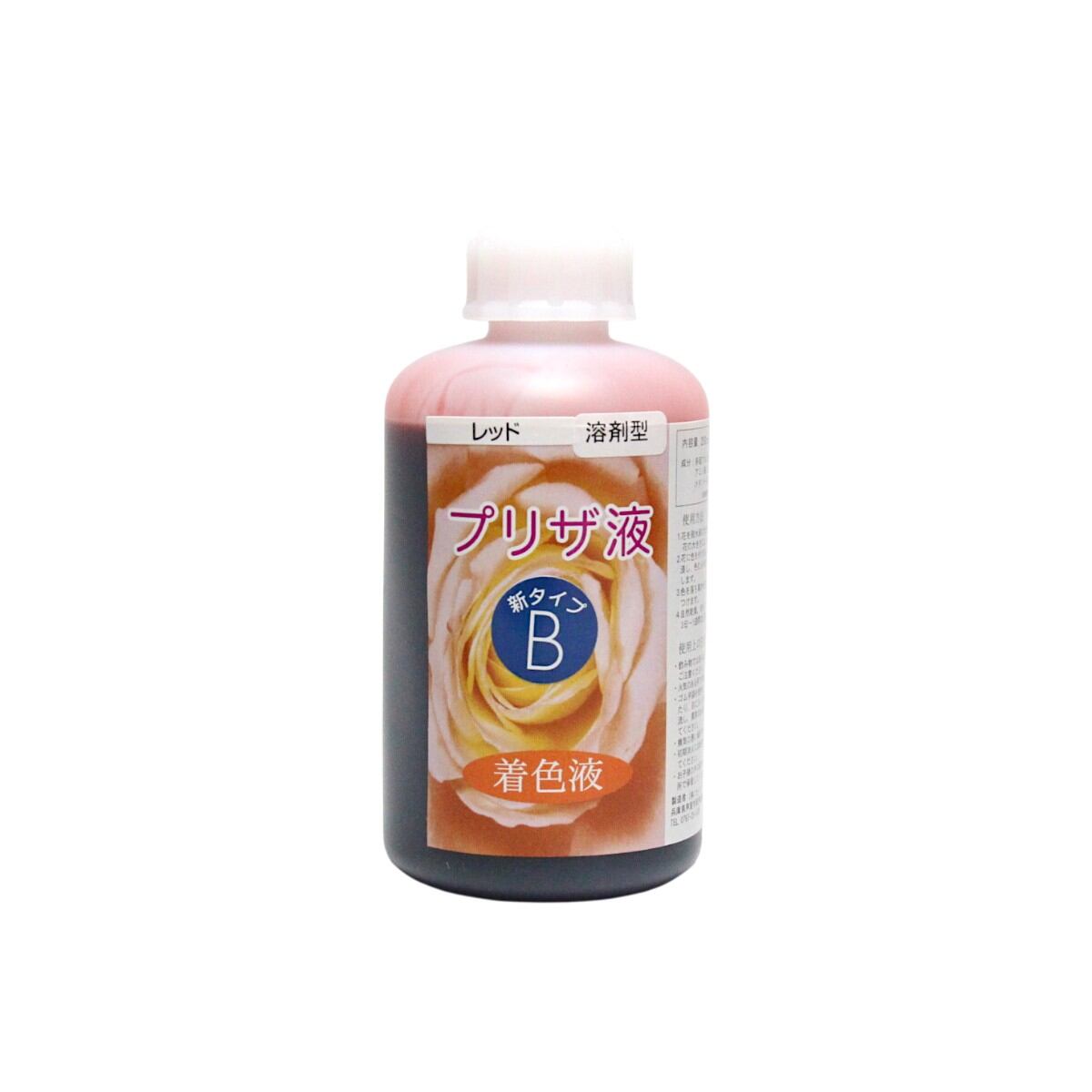 「プリザ液 新B レッド 溶剤 4リットル 1本」 4L 着色液 プリザーブドフラワー液 手作り 小花 葉物 手作り 花材 生花 資材 ハーバリウム オリジナルグッズ ハンドメイド デコレーション 脱水・脱色した花に着色を施し、長期保存可能にします。ムラなく染まり、速乾でベタつきを抑えた新タイプ。 生花の美しさをそのまま長く楽しめるプリザーブドフラワーを、自分で作ってみませんか。B液は、A液で脱水・脱色したお花に色を与え長期間美しい状態を維持するための液です。※本商品だけではプリザーブドフラワーを作ることはできません。必ずA液と併用してください。●成分:多価アルコール、アルコール、水、アミノ酸、カチオン系色素、メタノール含有(第4類 第1石油類 水溶性 危険等級ll)火気厳禁●プリザ液 Aアルコールが主成分の脱水液で、花を浸けると水分と置き換わって脱水・脱色されます。2〜3回再使用できますが、花の水分で徐々に効果が弱まり、花が硬くならなくなったら交換してください。着色後の洗浄にも使えます。●プリザ液 B脱水・脱色後の花に色を定着させる液で、A液と同じく花内部の液体と置き換わる仕組みです。花の種類により5〜10回ほど再使用できます。B液には溶剤タイプと水性タイプがあり、同じタイプ同士なら混色できますが、異なるタイプは混ぜないでください。溶剤系:発色が濃く定着しやすい。初心者にも扱いやすい。水性系:淡くきれいな色が多いが、定着力は弱め。色を混ぜる際、同じ種類同士で薄い色に濃い色を足すと調整しやすくなります。クリアは溶剤・水性どちらにも使える薄め液で、脱色後の花をそのまま保存する際にも使用できます。着色液を薄めて好みの色を作ることもでき、B液の色を薄める場合は同シリーズのクリア(B・新B・特新B)をご使用ください。●B・新Bの違いB:基本の着色液。濃く定着しますが外側にも色が付きます。A液での洗浄が重要です。新B:分子が小さく、ムラなく染まりやすいです。乾きが早くベタつきも少ない一方で、やや色あせしやすい傾向があります。●プリザ液 A・B 使用方法(1) 花の準備・バラ、カーネーション、トルコキキョウなどが適しています。・鮮度のよい花を選び、水揚げをしておくと仕上がりがきれいになります。(2) A液で脱色する・容器に花全体が浸かる量のA液に入れ、ふたをします。・6時間〜7日ほど浸けて脱色します(花の種類や大きさで時間は変わります)。・十分色が抜けたら取り出します。・脱色後は花が硬くなります。(3) B液で着色する・別容器にB液を入れ、脱色した花を浸します。・形が崩れないように注意し、必要に応じて糸やワイヤーで固定します。・24時間以上浸け、ふたをしておきます。(4) A液で色を定着させる・B液から取り出した花を、A液に約5分浸して表面の液を落とします。・長時間浸すと色落ちするため注意が必要です。・なるべく新しいA液を使うと安心です。(5) 乾燥させて完成・直射日光を避け、乾燥台に置いて乾燥させます。・ペットボトルに穴を開けた台や卵パックなども利用できます。・乾燥日数は花の種類や大きさによって変わります。・電子レンジ、食器乾燥機、ドライヤーを使う方法もあります。・完成直後の花は柔らかく、軽く触れる程度なら問題ありません(押しすぎには注意してください)。●注意事項(液のお取り扱いについて)プリザーブドフラワー液はアルコールでできています。安全性は高いものですが、以下のことにご注意ください。エタノールが主成分であり、学校などでアルコールランプで利用されるものです。液を使用する際は十分換気してご使用ください。火気は絶対厳禁ですので、火の近くではご使用にならないでください。使用後の液を捨てるときには20倍以上に薄めて流してください。・使用時は必ず換気を行ってください・火気の近くでは絶対に使用しないでください・ゴム手袋を着用してください・換気の悪い場所での使用は避けてください・お子様の手の届かない冷暗所で保管してください・飲み物ではありませんので誤飲に注意してください・皮膚や目に付着した場合はすぐに水で洗い流し、異常があれば医師に相談してください・初期消火には粉末または泡消火器を使用してください 5