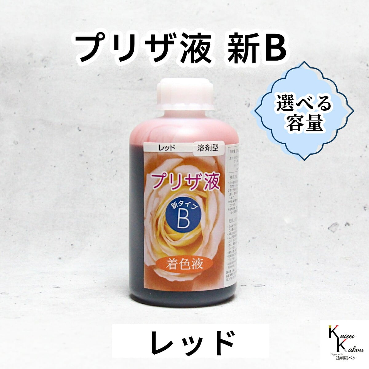 「プリザ液 新B レッド 溶剤 選べる容量 1本」 着色液 プリザーブドフラワー液 手作り 小花 葉物 手作り 花材 生花 資材 ハーバリウム オリジナルグッズ ハンドメイド デコレーション 脱水・脱色した花に着色を施し、長期保存可能にします。ムラなく染まり、速乾でベタつきを抑えた新タイプ。 生花の美しさをそのまま長く楽しめるプリザーブドフラワーを、自分で作ってみませんか。B液は、A液で脱水・脱色したお花に色を与え長期間美しい状態を維持するための液です。※本商品だけではプリザーブドフラワーを作ることはできません。必ずA液と併用してください。●成分:多価アルコール、アルコール、水、アミノ酸、カチオン系色素、メタノール含有(第4類 第1石油類 水溶性 危険等級ll)火気厳禁●プリザ液 Aアルコールが主成分の脱水液で、花を浸けると水分と置き換わって脱水・脱色されます。2〜3回再使用できますが、花の水分で徐々に効果が弱まり、花が硬くならなくなったら交換してください。着色後の洗浄にも使えます。●プリザ液 B脱水・脱色後の花に色を定着させる液で、A液と同じく花内部の液体と置き換わる仕組みです。花の種類により5〜10回ほど再使用できます。B液には溶剤タイプと水性タイプがあり、同じタイプ同士なら混色できますが、異なるタイプは混ぜないでください。溶剤型:発色が濃く定着しやすい。初心者にも扱いやすい。水性型:淡くきれいな色が多いが、定着力は弱め。色を混ぜる際、同じ種類同士で薄い色に濃い色を足すと調整しやすくなります。クリアは溶剤・水性どちらにも使える薄め液で、脱色後の花をそのまま保存する際にも使用できます。着色液を薄めて好みの色を作ることもでき、B液の色を薄める場合は同シリーズのクリア(B・新B・特新B)をご使用ください。●B・新Bの違いB:基本の着色液。濃く定着しますが外側にも色が付きます。A液での洗浄が重要です。新B:分子が小さく、ムラなく染まりやすいです。乾きが早くベタつきも少ない一方で、やや色あせしやすい傾向があります。●プリザ液 A・B 使用方法(1) 花の準備・バラ、カーネーション、トルコキキョウなどが適しています。・鮮度のよい花を選び、水揚げをしておくと仕上がりがきれいになります。(2) A液で脱色する・容器に花全体が浸かる量のA液に入れ、ふたをします。・6時間〜7日ほど浸けて脱色します(花の種類や大きさで時間は変わります)。・十分色が抜けたら取り出します。・脱色後は花が硬くなります。(3) B液で着色する・別容器にB液を入れ、脱色した花を浸します。・形が崩れないように注意し、必要に応じて糸やワイヤーで固定します。・24時間以上浸け、ふたをしておきます。(4) A液で色を定着させる・B液から取り出した花を、A液に約5分浸して表面の液を落とします。・長時間浸すと色落ちするため注意が必要です。・なるべく新しいA液を使うと安心です。(5) 乾燥させて完成・直射日光を避け、乾燥台に置いて乾燥させます。・ペットボトルに穴を開けた台や卵パックなども利用できます。・乾燥日数は花の種類や大きさによって変わります。・電子レンジ、食器乾燥機、ドライヤーを使う方法もあります。・完成直後の花は柔らかく、軽く触れる程度なら問題ありません(押しすぎには注意してください)。●注意事項(液のお取り扱いについて)プリザーブドフラワー液はアルコールでできています。安全性は高いものですが、以下のことにご注意ください。エタノールが主成分であり、学校などでアルコールランプで利用されるものです。液を使用する際は十分換気してご使用ください。火気は絶対厳禁ですので、火の近くではご使用にならないでください。使用後の液を捨てるときには20倍以上に薄めて流してください。・使用時は必ず換気を行ってください・火気の近くでは絶対に使用しないでください・ゴム手袋を着用してください・換気の悪い場所での使用は避けてください・お子様の手の届かない冷暗所で保管してください・飲み物ではありませんので誤飲に注意してください・皮膚や目に付着した場合はすぐに水で洗い流し、異常があれば医師に相談してください・初期消火には粉末または泡消火器を使用してください 5