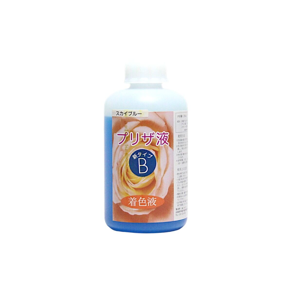 「プリザ液 新B スカイブルー 水性 4リットル 1本」 4L 着色液 プリザーブドフラワー液 手作り 小花 葉物 手作り 花材 生花 資材 ハーバリウム オリジナルグッズ ハンドメイド デコレーション 脱水・脱色した花に着色を施し、長期保存可能にします。ムラなく染まり、速乾でベタつきを抑えた新タイプ。 生花の美しさをそのまま長く楽しめるプリザーブドフラワーを、自分で作ってみませんか。B液は、A液で脱水・脱色したお花に色を与え長期間美しい状態を維持するための液です。※本商品だけではプリザーブドフラワーを作ることはできません。必ずA液と併用してください。●成分:多価アルコール、アルコール、水、アミノ酸、カチオン系色素、メタノール含有(第4類 第1石油類 水溶性 危険等級ll)火気厳禁●プリザ液 Aアルコールが主成分の脱水液で、花を浸けると水分と置き換わって脱水・脱色されます。2〜3回再使用できますが、花の水分で徐々に効果が弱まり、花が硬くならなくなったら交換してください。着色後の洗浄にも使えます。●プリザ液 B脱水・脱色後の花に色を定着させる液で、A液と同じく花内部の液体と置き換わる仕組みです。花の種類により5〜10回ほど再使用できます。B液には溶剤タイプと水性タイプがあり、同じタイプ同士なら混色できますが、異なるタイプは混ぜないでください。溶剤系:発色が濃く定着しやすい。初心者にも扱いやすい。水性系:淡くきれいな色が多いが、定着力は弱め。色を混ぜる際、同じ種類同士で薄い色に濃い色を足すと調整しやすくなります。クリアは溶剤・水性どちらにも使える薄め液で、脱色後の花をそのまま保存する際にも使用できます。着色液を薄めて好みの色を作ることもでき、B液の色を薄める場合は同シリーズのクリア(B・新B・特新B)をご使用ください。●B・新Bの違いB:基本の着色液。濃く定着しますが外側にも色が付きます。A液での洗浄が重要です。新B:分子が小さく、ムラなく染まりやすいです。乾きが早くベタつきも少ない一方で、やや色あせしやすい傾向があります。●プリザ液 A・B 使用方法(1) 花の準備・バラ、カーネーション、トルコキキョウなどが適しています。・鮮度のよい花を選び、水揚げをしておくと仕上がりがきれいになります。(2) A液で脱色する・容器に花全体が浸かる量のA液に入れ、ふたをします。・6時間〜7日ほど浸けて脱色します(花の種類や大きさで時間は変わります)。・十分色が抜けたら取り出します。・脱色後は花が硬くなります。(3) B液で着色する・別容器にB液を入れ、脱色した花を浸します。・形が崩れないように注意し、必要に応じて糸やワイヤーで固定します。・24時間以上浸け、ふたをしておきます。(4) A液で色を定着させる・B液から取り出した花を、A液に約5分浸して表面の液を落とします。・長時間浸すと色落ちするため注意が必要です。・なるべく新しいA液を使うと安心です。(5) 乾燥させて完成・直射日光を避け、乾燥台に置いて乾燥させます。・ペットボトルに穴を開けた台や卵パックなども利用できます。・乾燥日数は花の種類や大きさによって変わります。・電子レンジ、食器乾燥機、ドライヤーを使う方法もあります。・完成直後の花は柔らかく、軽く触れる程度なら問題ありません(押しすぎには注意してください)。●注意事項(液のお取り扱いについて)プリザーブドフラワー液はアルコールでできています。安全性は高いものですが、以下のことにご注意ください。エタノールが主成分であり、学校などでアルコールランプで利用されるものです。液を使用する際は十分換気してご使用ください。火気は絶対厳禁ですので、火の近くではご使用にならないでください。使用後の液を捨てるときには20倍以上に薄めて流してください。・使用時は必ず換気を行ってください・火気の近くでは絶対に使用しないでください・ゴム手袋を着用してください・換気の悪い場所での使用は避けてください・お子様の手の届かない冷暗所で保管してください・飲み物ではありませんので誤飲に注意してください・皮膚や目に付着した場合はすぐに水で洗い流し、異常があれば医師に相談してください・初期消火には粉末または泡消火器を使用してください 5