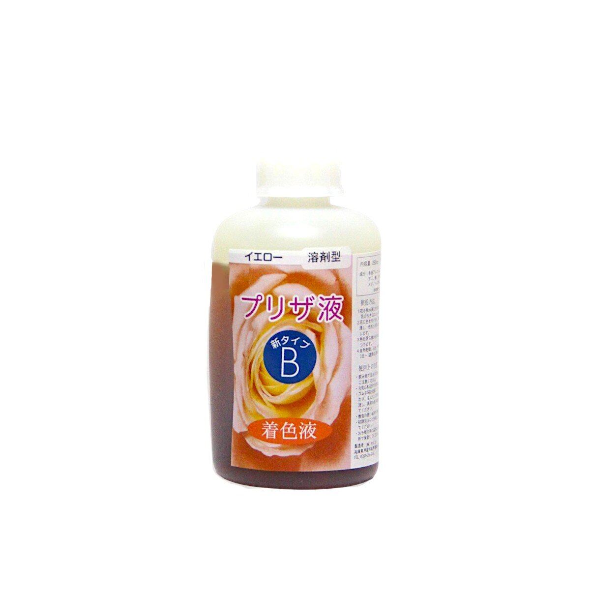「プリザ液 新B イエロー 溶剤 選べる容量 1本」 着色液 プリザーブドフラワー液 手作り 小花 葉物 手作り 花材 生花 資材 ハーバリウム オリジナルグッズ ハンドメイド デコレーション 脱水・脱色した花に着色を施し、長期保存可能にします。ムラなく染まり、速乾でベタつきを抑えた新タイプ。 生花の美しさをそのまま長く楽しめるプリザーブドフラワーを、自分で作ってみませんか。B液は、A液で脱水・脱色したお花に色を与え長期間美しい状態を維持するための液です。※本商品だけではプリザーブドフラワーを作ることはできません。必ずA液と併用してください。●成分:多価アルコール、アルコール、水、アミノ酸、カチオン系色素、メタノール含有(第4類 第1石油類 水溶性 危険等級ll)火気厳禁●プリザ液 Aアルコールが主成分の脱水液で、花を浸けると水分と置き換わって脱水・脱色されます。2〜3回再使用できますが、花の水分で徐々に効果が弱まり、花が硬くならなくなったら交換してください。着色後の洗浄にも使えます。●プリザ液 B脱水・脱色後の花に色を定着させる液で、A液と同じく花内部の液体と置き換わる仕組みです。花の種類により5〜10回ほど再使用できます。B液には溶剤タイプと水性タイプがあり、同じタイプ同士なら混色できますが、異なるタイプは混ぜないでください。溶剤型:発色が濃く定着しやすい。初心者にも扱いやすい。水性型:淡くきれいな色が多いが、定着力は弱め。色を混ぜる際、同じ種類同士で薄い色に濃い色を足すと調整しやすくなります。クリアは溶剤・水性どちらにも使える薄め液で、脱色後の花をそのまま保存する際にも使用できます。着色液を薄めて好みの色を作ることもでき、B液の色を薄める場合は同シリーズのクリア(B・新B・特新B)をご使用ください。●B・新Bの違いB:基本の着色液。濃く定着しますが外側にも色が付きます。A液での洗浄が重要です。新B:分子が小さく、ムラなく染まりやすいです。乾きが早くベタつきも少ない一方で、やや色あせしやすい傾向があります。●プリザ液 A・B 使用方法(1) 花の準備・バラ、カーネーション、トルコキキョウなどが適しています。・鮮度のよい花を選び、水揚げをしておくと仕上がりがきれいになります。(2) A液で脱色する・容器に花全体が浸かる量のA液に入れ、ふたをします。・6時間〜7日ほど浸けて脱色します(花の種類や大きさで時間は変わります)。・十分色が抜けたら取り出します。・脱色後は花が硬くなります。(3) B液で着色する・別容器にB液を入れ、脱色した花を浸します。・形が崩れないように注意し、必要に応じて糸やワイヤーで固定します。・24時間以上浸け、ふたをしておきます。(4) A液で色を定着させる・B液から取り出した花を、A液に約5分浸して表面の液を落とします。・長時間浸すと色落ちするため注意が必要です。・なるべく新しいA液を使うと安心です。(5) 乾燥させて完成・直射日光を避け、乾燥台に置いて乾燥させます。・ペットボトルに穴を開けた台や卵パックなども利用できます。・乾燥日数は花の種類や大きさによって変わります。・電子レンジ、食器乾燥機、ドライヤーを使う方法もあります。・完成直後の花は柔らかく、軽く触れる程度なら問題ありません(押しすぎには注意してください)。●注意事項(液のお取り扱いについて)プリザーブドフラワー液はアルコールでできています。安全性は高いものですが、以下のことにご注意ください。エタノールが主成分であり、学校などでアルコールランプで利用されるものです。液を使用する際は十分換気してご使用ください。火気は絶対厳禁ですので、火の近くではご使用にならないでください。使用後の液を捨てるときには20倍以上に薄めて流してください。・使用時は必ず換気を行ってください・火気の近くでは絶対に使用しないでください・ゴム手袋を着用してください・換気の悪い場所での使用は避けてください・お子様の手の届かない冷暗所で保管してください・飲み物ではありませんので誤飲に注意してください・皮膚や目に付着した場合はすぐに水で洗い流し、異常があれば医師に相談してください・初期消火には粉末または泡消火器を使用してください 5