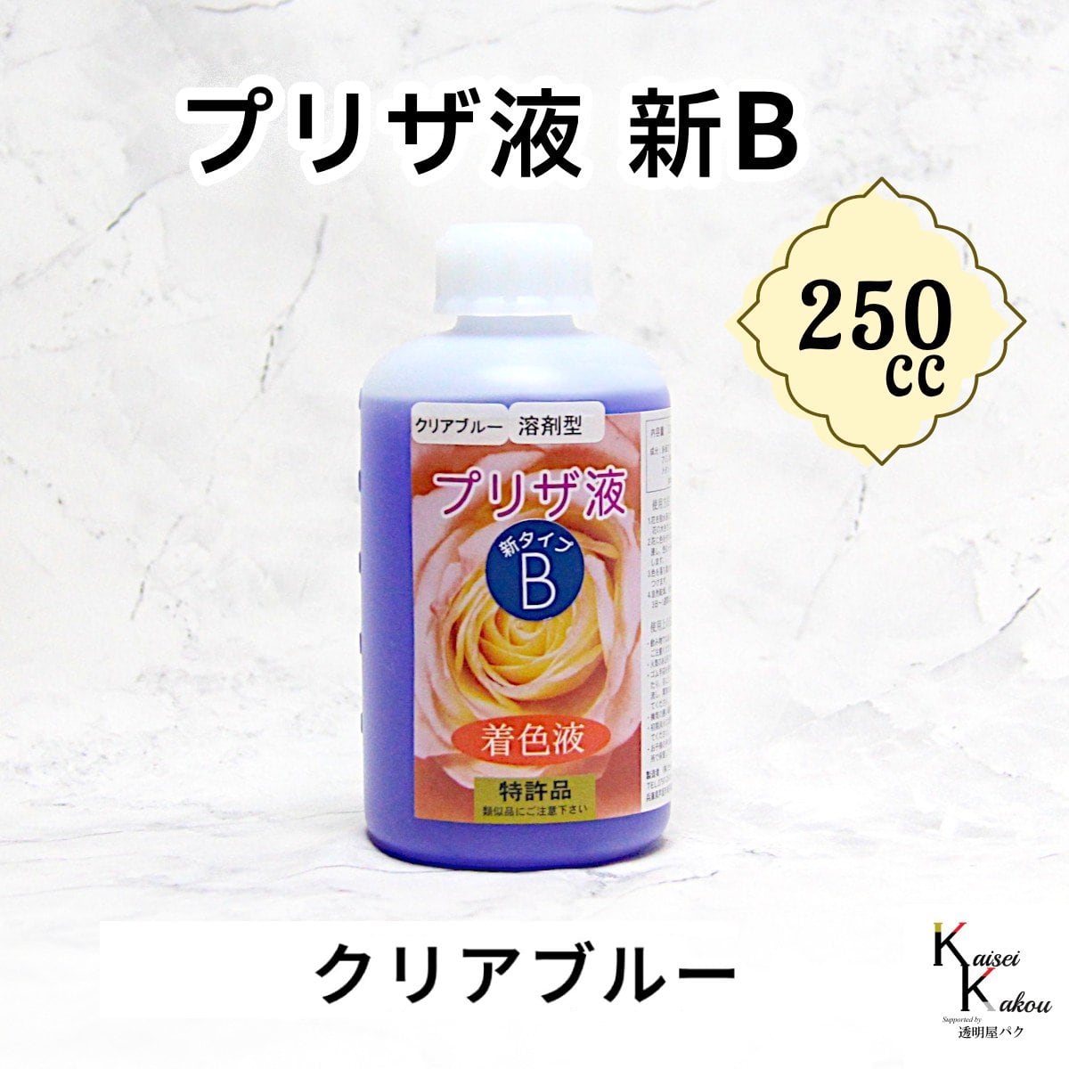 「プリザ液 新B クリアブルー 溶剤 250cc 1本」 着色液 プリザーブドフラワー液 手作り 小花 葉物 花材 生花 資材 ハーバリウム オリジナルグッズ ハンドメイド デコレーション 脱水・脱色した花に着色を施し、長期保存可能にします。ムラなく染まり、速乾でベタつきを抑えた新タイプ。 生花の美しさをそのまま長く楽しめるプリザーブドフラワーを、自分で作ってみませんか。B液は、A液で脱水・脱色したお花に色を与え長期間美しい状態を維持するための液です。※本商品だけではプリザーブドフラワーを作ることはできません。必ずA液と併用してください。●成分:多価アルコール、アルコール、水、アミノ酸、カチオン系色素、メタノール含有(第4類 第1石油類 水溶性 危険等級ll)火気厳禁●プリザ液 Aアルコールが主成分の脱水液で、花を浸けると水分と置き換わって脱水・脱色されます。2〜3回再使用できますが、花の水分で徐々に効果が弱まり、花が硬くならなくなったら交換してください。着色後の洗浄にも使えます。●プリザ液 B脱水・脱色後の花に色を定着させる液で、A液と同じく花内部の液体と置き換わる仕組みです。花の種類により5〜10回ほど再使用できます。B液には溶剤タイプと水性タイプがあり、同じタイプ同士なら混色できますが、異なるタイプは混ぜないでください。溶剤系:発色が濃く定着しやすい。初心者にも扱いやすい。水性系:淡くきれいな色が多いが、定着力は弱め。色を混ぜる際、同じ種類同士で薄い色に濃い色を足すと調整しやすくなります。クリアは溶剤・水性どちらにも使える薄め液で、脱色後の花をそのまま保存する際にも使用できます。着色液を薄めて好みの色を作ることもでき、B液の色を薄める場合は同シリーズのクリア(B・新B・特新B)をご使用ください。●B・新Bの違いB:基本の着色液。濃く定着しますが外側にも色が付きます。A液での洗浄が重要です。新B:分子が小さく、ムラなく染まりやすいです。乾きが早くベタつきも少ない一方で、やや色あせしやすい傾向があります。●プリザ液 A・B 使用方法(1) 花の準備・バラ、カーネーション、トルコキキョウなどが適しています。・鮮度のよい花を選び、水揚げをしておくと仕上がりがきれいになります。(2) A液で脱色する・容器に花全体が浸かる量のA液に入れ、ふたをします。・6時間〜7日ほど浸けて脱色します(花の種類や大きさで時間は変わります)。・十分色が抜けたら取り出します。・脱色後は花が硬くなります。(3) B液で着色する・別容器にB液を入れ、脱色した花を浸します。・形が崩れないように注意し、必要に応じて糸やワイヤーで固定します。・24時間以上浸け、ふたをしておきます。(4) A液で色を定着させる・B液から取り出した花を、A液に約5分浸して表面の液を落とします。・長時間浸すと色落ちするため注意が必要です。・なるべく新しいA液を使うと安心です。(5) 乾燥させて完成・直射日光を避け、乾燥台に置いて乾燥させます。・ペットボトルに穴を開けた台や卵パックなども利用できます。・乾燥日数は花の種類や大きさによって変わります。・電子レンジ、食器乾燥機、ドライヤーを使う方法もあります。・完成直後の花は柔らかく、軽く触れる程度なら問題ありません(押しすぎには注意してください)。●注意事項(液のお取り扱いについて)プリザーブドフラワー液はアルコールでできています。安全性は高いものですが、以下のことにご注意ください。エタノールが主成分であり、学校などでアルコールランプで利用されるものです。液を使用する際は十分換気してご使用ください。火気は絶対厳禁ですので、火の近くではご使用にならないでください。使用後の液を捨てるときには20倍以上に薄めて流してください。・使用時は必ず換気を行ってください・火気の近くでは絶対に使用しないでください・ゴム手袋を着用してください・換気の悪い場所での使用は避けてください・お子様の手の届かない冷暗所で保管してください・飲み物ではありませんので誤飲に注意してください・皮膚や目に付着した場合はすぐに水で洗い流し、異常があれば医師に相談してください・初期消火には粉末または泡消火器を使用してください 5