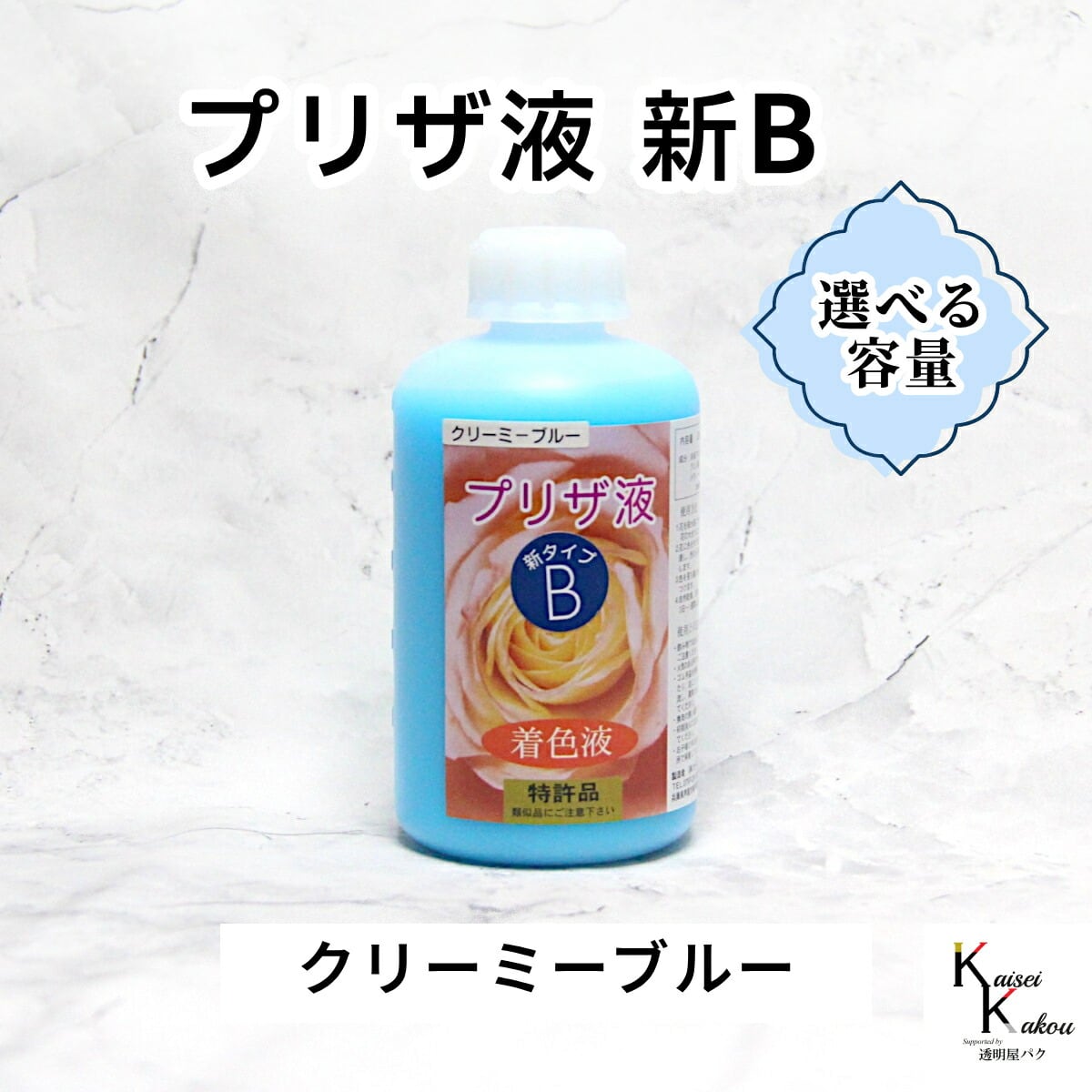 「プリザ液 新B クリーミーブルー 溶剤 選べる容量 1本」 着色液 プリザーブドフラワー液 手作り 小花 葉物 花材 生花 資材 ハーバリウム オリジナルグッズ ハンドメイド デコレーション 脱水・脱色した花に着色を施し、長期保存可能にします。ムラなく染まり、速乾でベタつきを抑えた新タイプ。 生花の美しさをそのまま長く楽しめるプリザーブドフラワーを、自分で作ってみませんか。B液は、A液で脱水・脱色したお花に色を与え長期間美しい状態を維持するための液です。※本商品だけではプリザーブドフラワーを作ることはできません。必ずA液と併用してください。●成分:多価アルコール、アルコール、水、アミノ酸、カチオン系色素、メタノール含有(第4類 第1石油類 水溶性 危険等級ll)火気厳禁●プリザ液 Aアルコールが主成分の脱水液で、花を浸けると水分と置き換わって脱水・脱色されます。2〜3回再使用できますが、花の水分で徐々に効果が弱まり、花が硬くならなくなったら交換してください。着色後の洗浄にも使えます。●プリザ液 B脱水・脱色後の花に色を定着させる液で、A液と同じく花内部の液体と置き換わる仕組みです。花の種類により5〜10回ほど再使用できます。B液には溶剤タイプと水性タイプがあり、同じタイプ同士なら混色できますが、異なるタイプは混ぜないでください。溶剤系:発色が濃く定着しやすい。初心者にも扱いやすい。水性系:淡くきれいな色が多いが、定着力は弱め。色を混ぜる際、同じ種類同士で薄い色に濃い色を足すと調整しやすくなります。クリアは溶剤・水性どちらにも使える薄め液で、脱色後の花をそのまま保存する際にも使用できます。着色液を薄めて好みの色を作ることもでき、B液の色を薄める場合は同シリーズのクリア(B・新B・特新B)をご使用ください。●B・新Bの違いB:基本の着色液。濃く定着しますが外側にも色が付きます。A液での洗浄が重要です。新B:分子が小さく、ムラなく染まりやすいです。乾きが早くベタつきも少ない一方で、やや色あせしやすい傾向があります。●プリザ液 A・B 使用方法(1) 花の準備・バラ、カーネーション、トルコキキョウなどが適しています。・鮮度のよい花を選び、水揚げをしておくと仕上がりがきれいになります。(2) A液で脱色する・容器に花全体が浸かる量のA液に入れ、ふたをします。・6時間〜7日ほど浸けて脱色します(花の種類や大きさで時間は変わります)。・十分色が抜けたら取り出します。・脱色後は花が硬くなります。(3) B液で着色する・別容器にB液を入れ、脱色した花を浸します。・形が崩れないように注意し、必要に応じて糸やワイヤーで固定します。・24時間以上浸け、ふたをしておきます。(4) A液で色を定着させる・B液から取り出した花を、A液に約5分浸して表面の液を落とします。・長時間浸すと色落ちするため注意が必要です。・なるべく新しいA液を使うと安心です。(5) 乾燥させて完成・直射日光を避け、乾燥台に置いて乾燥させます。・ペットボトルに穴を開けた台や卵パックなども利用できます。・乾燥日数は花の種類や大きさによって変わります。・電子レンジ、食器乾燥機、ドライヤーを使う方法もあります。・完成直後の花は柔らかく、軽く触れる程度なら問題ありません(押しすぎには注意してください)。●注意事項(液のお取り扱いについて)プリザーブドフラワー液はアルコールでできています。安全性は高いものですが、以下のことにご注意ください。エタノールが主成分であり、学校などでアルコールランプで利用されるものです。液を使用する際は十分換気してご使用ください。火気は絶対厳禁ですので、火の近くではご使用にならないでください。使用後の液を捨てるときには20倍以上に薄めて流してください。・使用時は必ず換気を行ってください・火気の近くでは絶対に使用しないでください・ゴム手袋を着用してください・換気の悪い場所での使用は避けてください・お子様の手の届かない冷暗所で保管してください・飲み物ではありませんので誤飲に注意してください・皮膚や目に付着した場合はすぐに水で洗い流し、異常があれば医師に相談してください・初期消火には粉末または泡消火器を使用してください 5