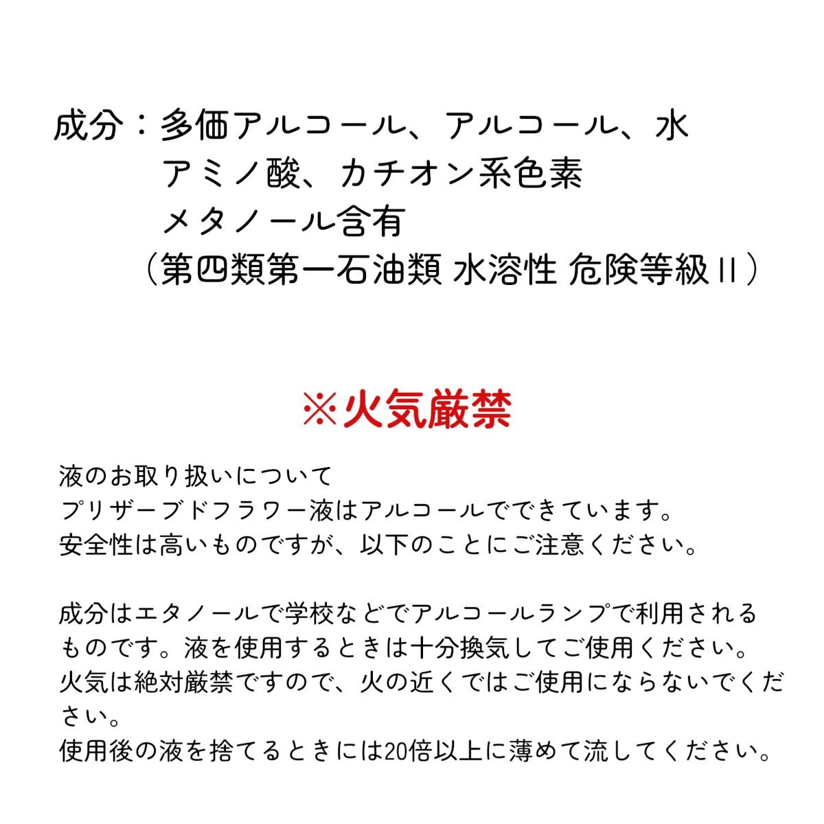 「プリザ液 新B クリアイエロー 溶剤 500cc 1本」 着色液 プリザーブドフラワー液 手作り 小花 葉物 花材 生花 資材 ハーバリウム オリジナルグッズ ハンドメイド デコレーション 脱水・脱色した花に着色を施し、長期保存可能にします。ムラなく染まり、速乾でベタつきを抑えた新タイプ。 生花の美しさをそのまま長く楽しめるプリザーブドフラワーを、自分で作ってみませんか。B液は、A液で脱水・脱色したお花に色を与え長期間美しい状態を維持するための液です。※本商品だけではプリザーブドフラワーを作ることはできません。必ずA液と併用してください。●成分:多価アルコール、アルコール、水、アミノ酸、カチオン系色素、メタノール含有(第4類 第1石油類 水溶性 危険等級ll)火気厳禁●プリザ液 Aアルコールが主成分の脱水液で、花を浸けると水分と置き換わって脱水・脱色されます。2〜3回再使用できますが、花の水分で徐々に効果が弱まり、花が硬くならなくなったら交換してください。着色後の洗浄にも使えます。●プリザ液 B脱水・脱色後の花に色を定着させる液で、A液と同じく花内部の液体と置き換わる仕組みです。花の種類により5〜10回ほど再使用できます。B液には溶剤タイプと水性タイプがあり、同じタイプ同士なら混色できますが、異なるタイプは混ぜないでください。溶剤系:発色が濃く定着しやすい。初心者にも扱いやすい。水性系:淡くきれいな色が多いが、定着力は弱め。色を混ぜる際、同じ種類同士で薄い色に濃い色を足すと調整しやすくなります。クリアは溶剤・水性どちらにも使える薄め液で、脱色後の花をそのまま保存する際にも使用できます。着色液を薄めて好みの色を作ることもでき、B液の色を薄める場合は同シリーズのクリア(B・新B・特新B)をご使用ください。●B・新Bの違いB:基本の着色液。濃く定着しますが外側にも色が付きます。A液での洗浄が重要です。新B:分子が小さく、ムラなく染まりやすいです。乾きが早くベタつきも少ない一方で、やや色あせしやすい傾向があります。●プリザ液 A・B 使用方法(1) 花の準備・バラ、カーネーション、トルコキキョウなどが適しています。・鮮度のよい花を選び、水揚げをしておくと仕上がりがきれいになります。(2) A液で脱色する・容器に花全体が浸かる量のA液に入れ、ふたをします。・6時間〜7日ほど浸けて脱色します(花の種類や大きさで時間は変わります)。・十分色が抜けたら取り出します。・脱色後は花が硬くなります。(3) B液で着色する・別容器にB液を入れ、脱色した花を浸します。・形が崩れないように注意し、必要に応じて糸やワイヤーで固定します。・24時間以上浸け、ふたをしておきます。(4) A液で色を定着させる・B液から取り出した花を、A液に約5分浸して表面の液を落とします。・長時間浸すと色落ちするため注意が必要です。・なるべく新しいA液を使うと安心です。(5) 乾燥させて完成・直射日光を避け、乾燥台に置いて乾燥させます。・ペットボトルに穴を開けた台や卵パックなども利用できます。・乾燥日数は花の種類や大きさによって変わります。・電子レンジ、食器乾燥機、ドライヤーを使う方法もあります。・完成直後の花は柔らかく、軽く触れる程度なら問題ありません(押しすぎには注意してください)。●注意事項(液のお取り扱いについて)プリザーブドフラワー液はアルコールでできています。安全性は高いものですが、以下のことにご注意ください。エタノールが主成分であり、学校などでアルコールランプで利用されるものです。液を使用する際は十分換気してご使用ください。火気は絶対厳禁ですので、火の近くではご使用にならないでください。使用後の液を捨てるときには20倍以上に薄めて流してください。・使用時は必ず換気を行ってください・火気の近くでは絶対に使用しないでください・ゴム手袋を着用してください・換気の悪い場所での使用は避けてください・お子様の手の届かない冷暗所で保管してください・飲み物ではありませんので誤飲に注意してください・皮膚や目に付着した場合はすぐに水で洗い流し、異常があれば医師に相談してください・初期消火には粉末または泡消火器を使用してください 5