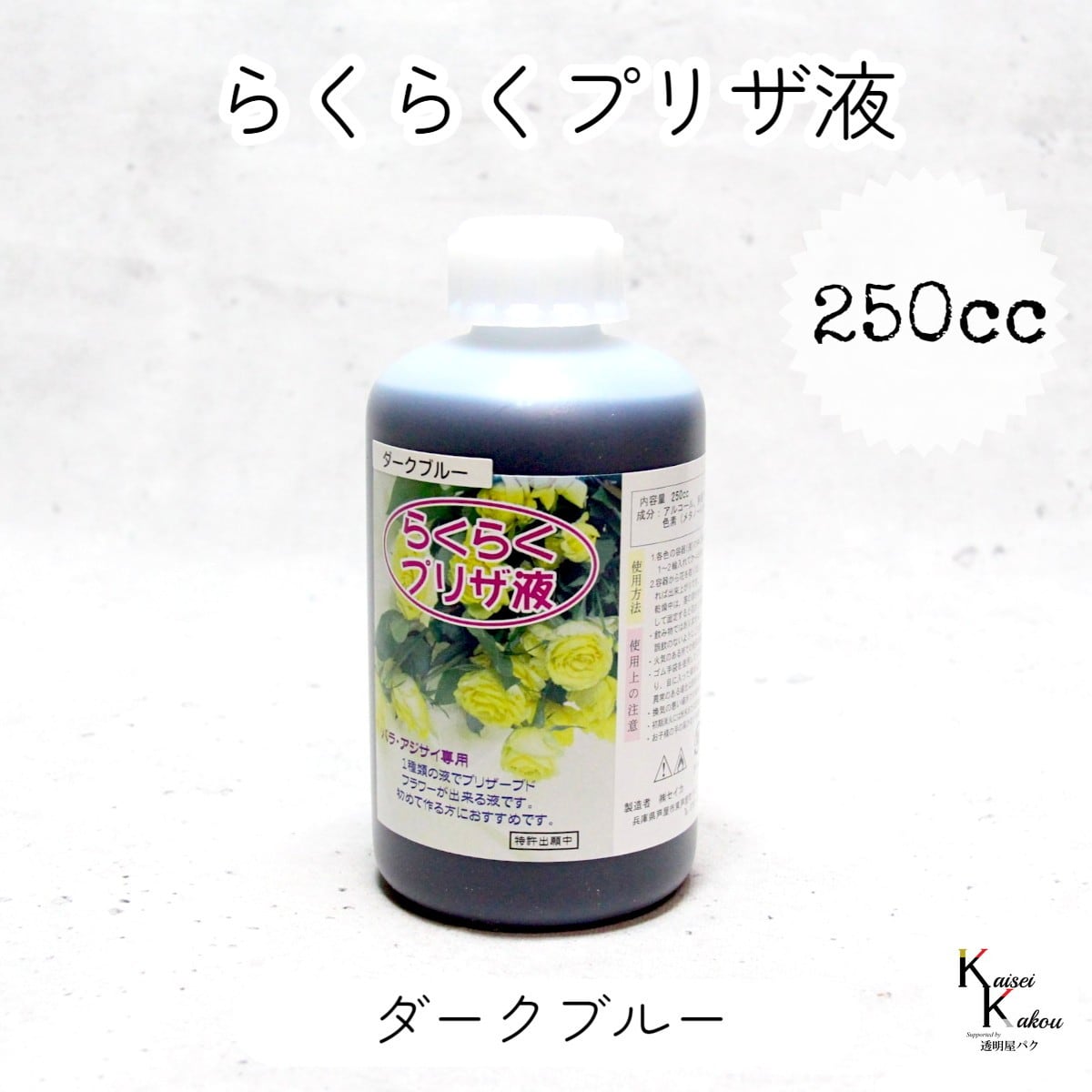 「らくらくプリザ液 ダークブルー(水性) 250cc 1本」 1液タイプ 1液型 バラ アジサイ 簡易作成液 プリザーブドフラワー液 手作り 小花 葉物 手作り 資材 ハーバリウム オリジナルグッズ ハンドメイド デコレーション 初めてでも失敗しにくい!1種類の液だけで、美しいプリザーブドフラワーが完成します。