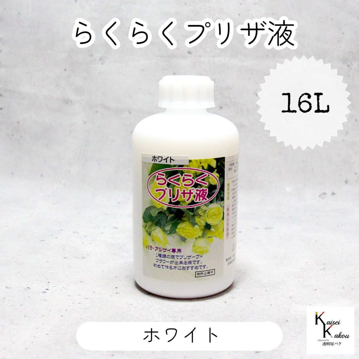 「らくらくプリザ液 ホワイト (水性) 16リットル 1本」 1液タイプ 1液型 バラ アジサイ 簡易作成液 プリザーブドフラワー液 手作り 小花 葉物 手作り 資材 ハーバリウム オリジナルグッズ ハンドメイド デコレーション